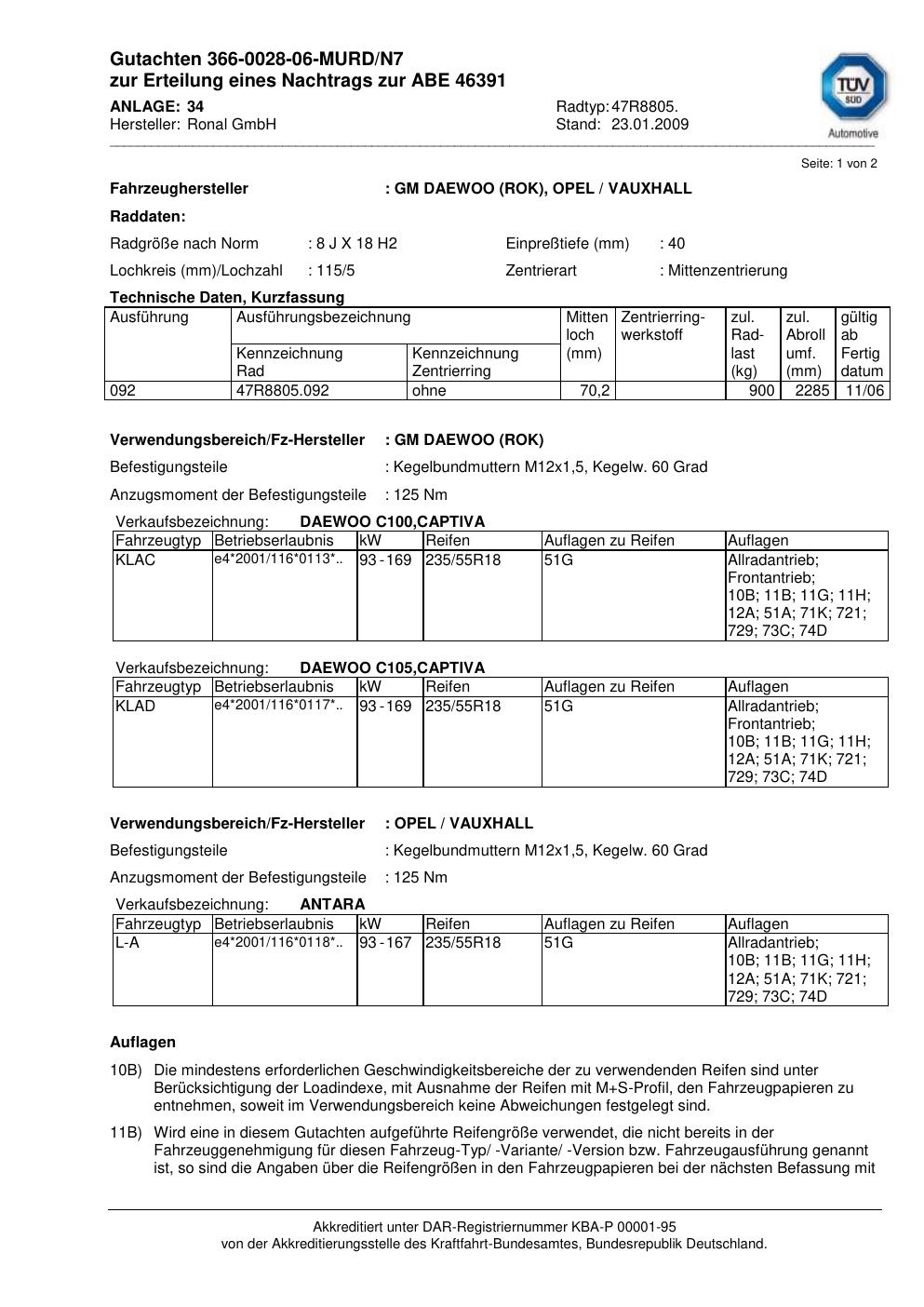 Dieses Gutachten (abe) bezieht sich auf die Alufelge Ronal 47R8805 in der Ausführung 8Jx18 ET 0, Mittenloch 0 mm (KBA 46391). Im PDF findest du typischerweise zulässige Reifengrößen, Auflagen/Anbauhinweise und – je nach Dokument – Hinweise zur Eintragung.