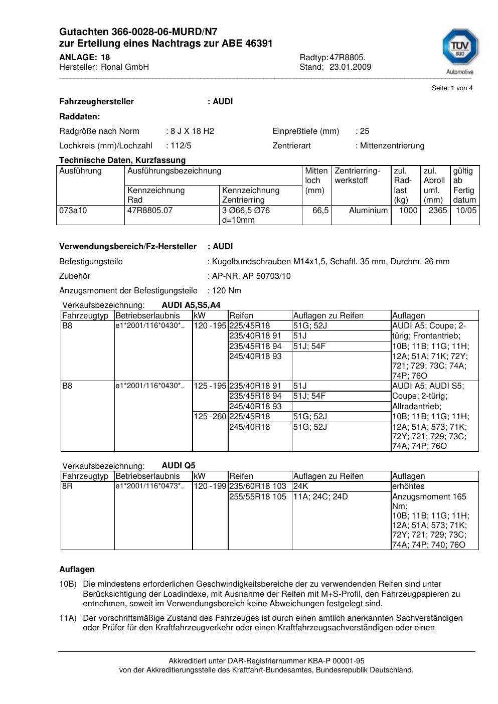 Dieses Gutachten (abe) bezieht sich auf die Alufelge brand-ronal 47R8805 in der Ausführung 8Jx18 ET 0, Mittenloch 0 mm (KBA 46391). Im PDF findest du typischerweise zulässige Reifengrößen, Auflagen/Anbauhinweise und – je nach Dokument – Hinweise zur Eintragung.
