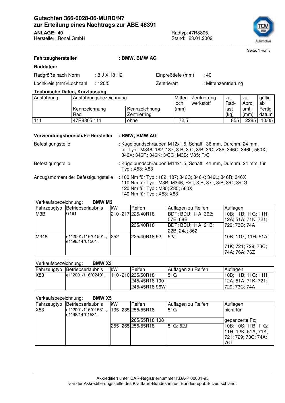 Dieses Gutachten (abe) bezieht sich auf die Alufelge Ronal 47R8805 in der Ausführung 8Jx18 ET 0, Mittenloch 0 mm (KBA 46391). Im PDF findest du typischerweise zulässige Reifengrößen, Auflagen/Anbauhinweise und – je nach Dokument – Hinweise zur Eintragung.