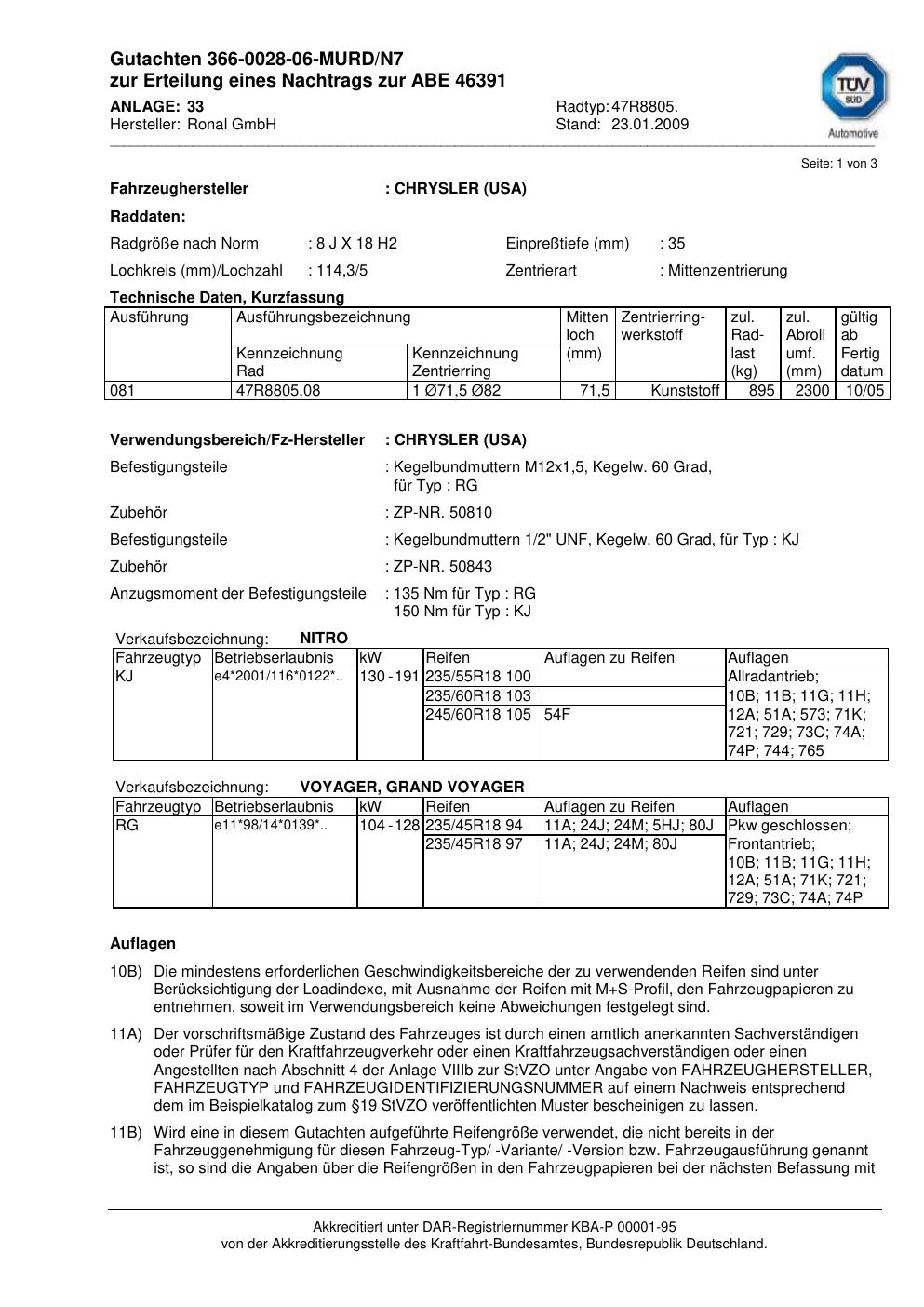 Dieses Gutachten (abe) bezieht sich auf die Alufelge Ronal 47R8805 in der Ausführung 8Jx18 ET 0, Mittenloch 0 mm (KBA 46391). Im PDF findest du typischerweise zulässige Reifengrößen, Auflagen/Anbauhinweise und – je nach Dokument – Hinweise zur Eintragung.