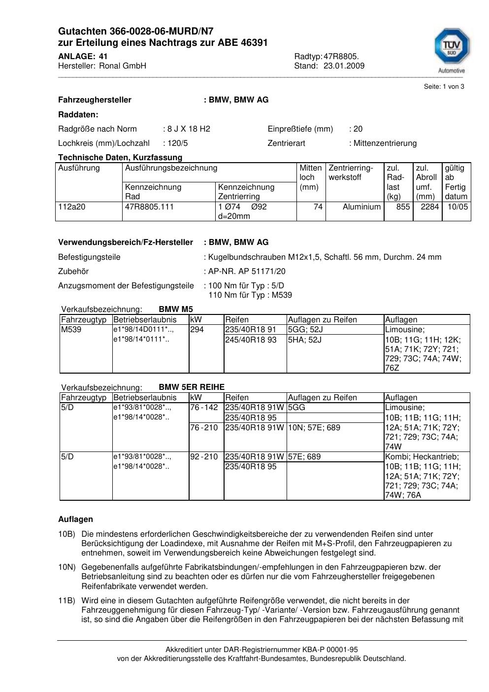 Dieses Gutachten (abe) bezieht sich auf die Alufelge brand-ronal 47R8805 in der Ausführung 8Jx18 ET 0, Mittenloch 0 mm (KBA 46391). Im PDF findest du typischerweise zulässige Reifengrößen, Auflagen/Anbauhinweise und – je nach Dokument – Hinweise zur Eintragung.