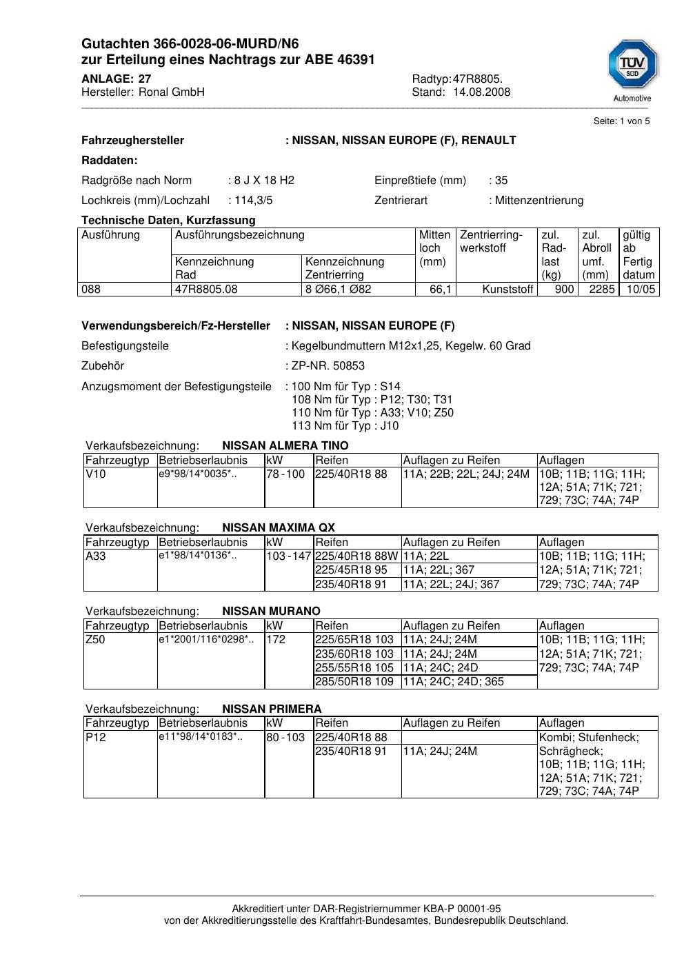 Dieses Gutachten (abe) bezieht sich auf die Alufelge Ronal 47R8805 in der Ausführung 8Jx18 ET 0, Mittenloch 0 mm (KBA 46391). Im PDF findest du typischerweise zulässige Reifengrößen, Auflagen/Anbauhinweise und – je nach Dokument – Hinweise zur Eintragung.