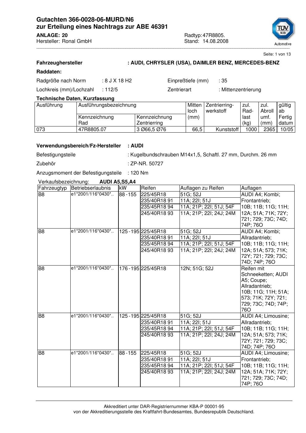 Dieses Gutachten (abe) bezieht sich auf die Alufelge Ronal 47R8805 in der Ausführung 8Jx18 ET 0, Mittenloch 0 mm (KBA 46391). Im PDF findest du typischerweise zulässige Reifengrößen, Auflagen/Anbauhinweise und – je nach Dokument – Hinweise zur Eintragung.