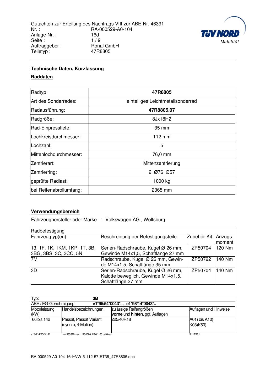 Dieses Gutachten (abe) bezieht sich auf die Alufelge brand-ronal 47R8805 in der Ausführung 8Jx18 ET 0, Mittenloch 0 mm (KBA 46391). Im PDF findest du typischerweise zulässige Reifengrößen, Auflagen/Anbauhinweise und – je nach Dokument – Hinweise zur Eintragung.