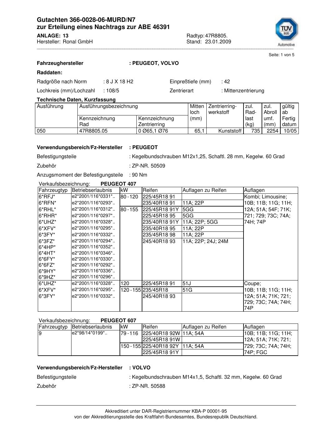 Dieses Gutachten (abe) bezieht sich auf die Alufelge Ronal 47R8805 in der Ausführung 8Jx18 ET 0, Mittenloch 0 mm (KBA 46391). Im PDF findest du typischerweise zulässige Reifengrößen, Auflagen/Anbauhinweise und – je nach Dokument – Hinweise zur Eintragung.