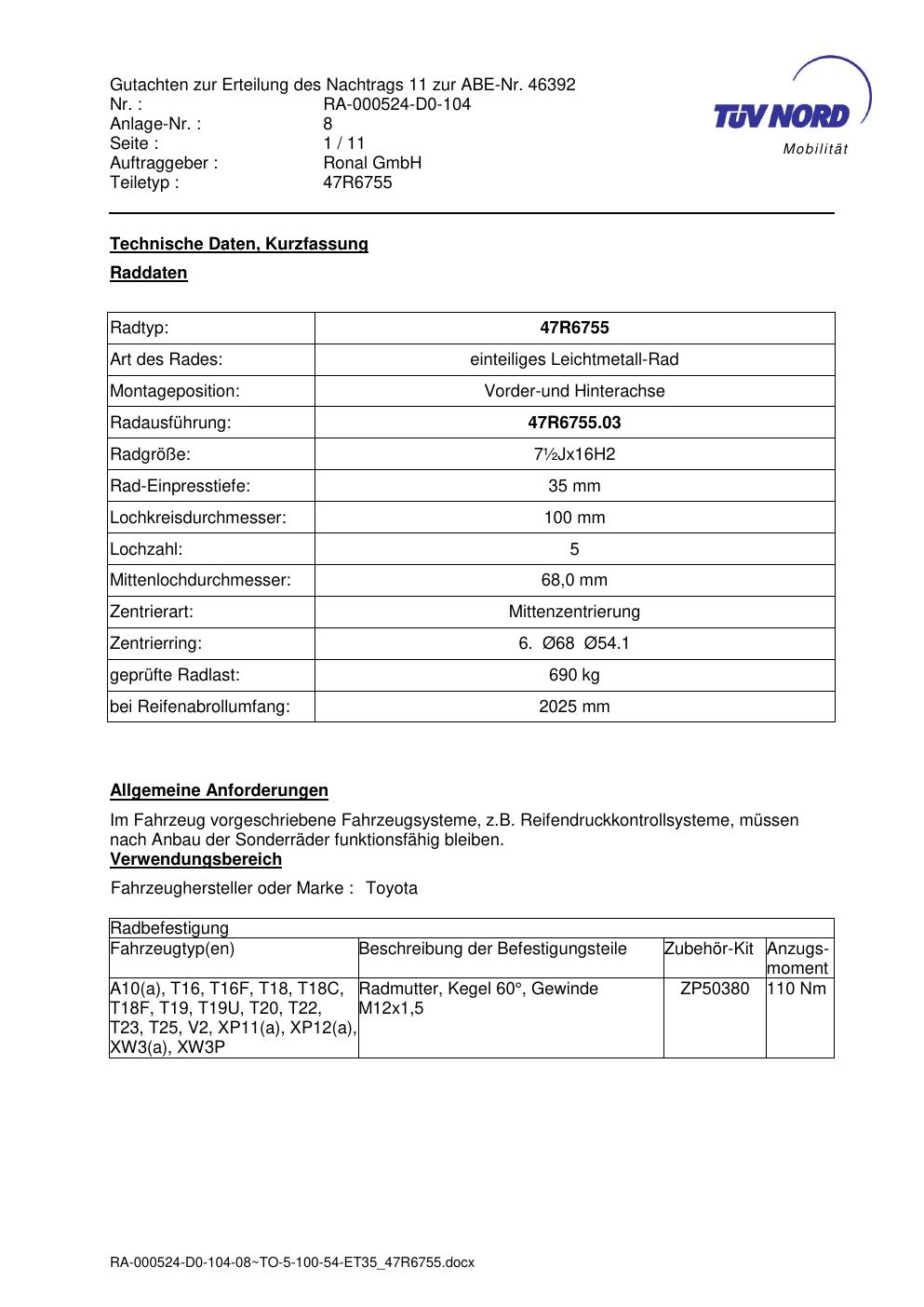 Dieses Gutachten (abe) bezieht sich auf die Alufelge Ronal 47R6755 in der Ausführung ET 0, Mittenloch 0 mm (KBA 46392). Im PDF findest du typischerweise zulässige Reifengrößen, Auflagen/Anbauhinweise und – je nach Dokument – Hinweise zur Eintragung.