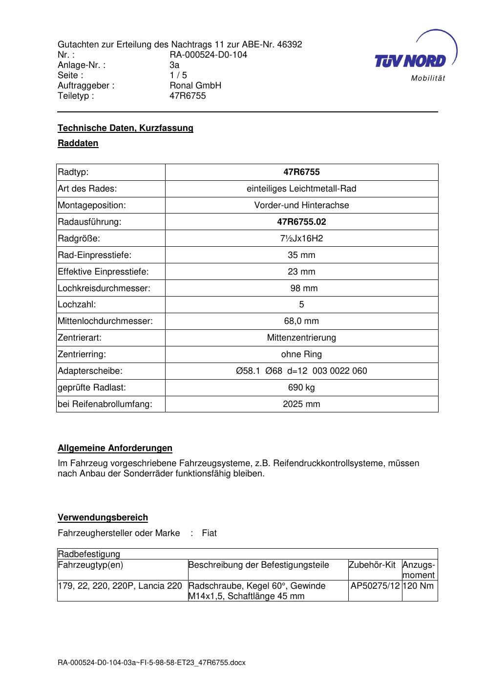 Dieses Gutachten (abe) bezieht sich auf die Alufelge brand-ronal 47R6755 in der Ausführung ET 0, Mittenloch 0 mm (KBA 46392). Im PDF findest du typischerweise zulässige Reifengrößen, Auflagen/Anbauhinweise und – je nach Dokument – Hinweise zur Eintragung.