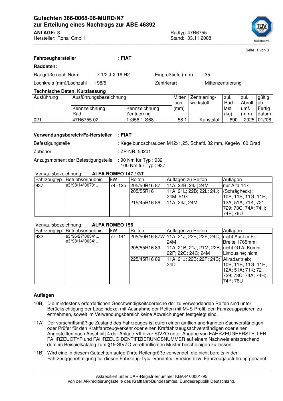 Dieses Gutachten (abe) bezieht sich auf die Alufelge Ronal 47R6755 in der Ausführung 2Jx16 ET 0, Mittenloch 0 mm (KBA 46392). Im PDF findest du typischerweise zulässige Reifengrößen, Auflagen/Anbauhinweise und – je nach Dokument – Hinweise zur Eintragung.