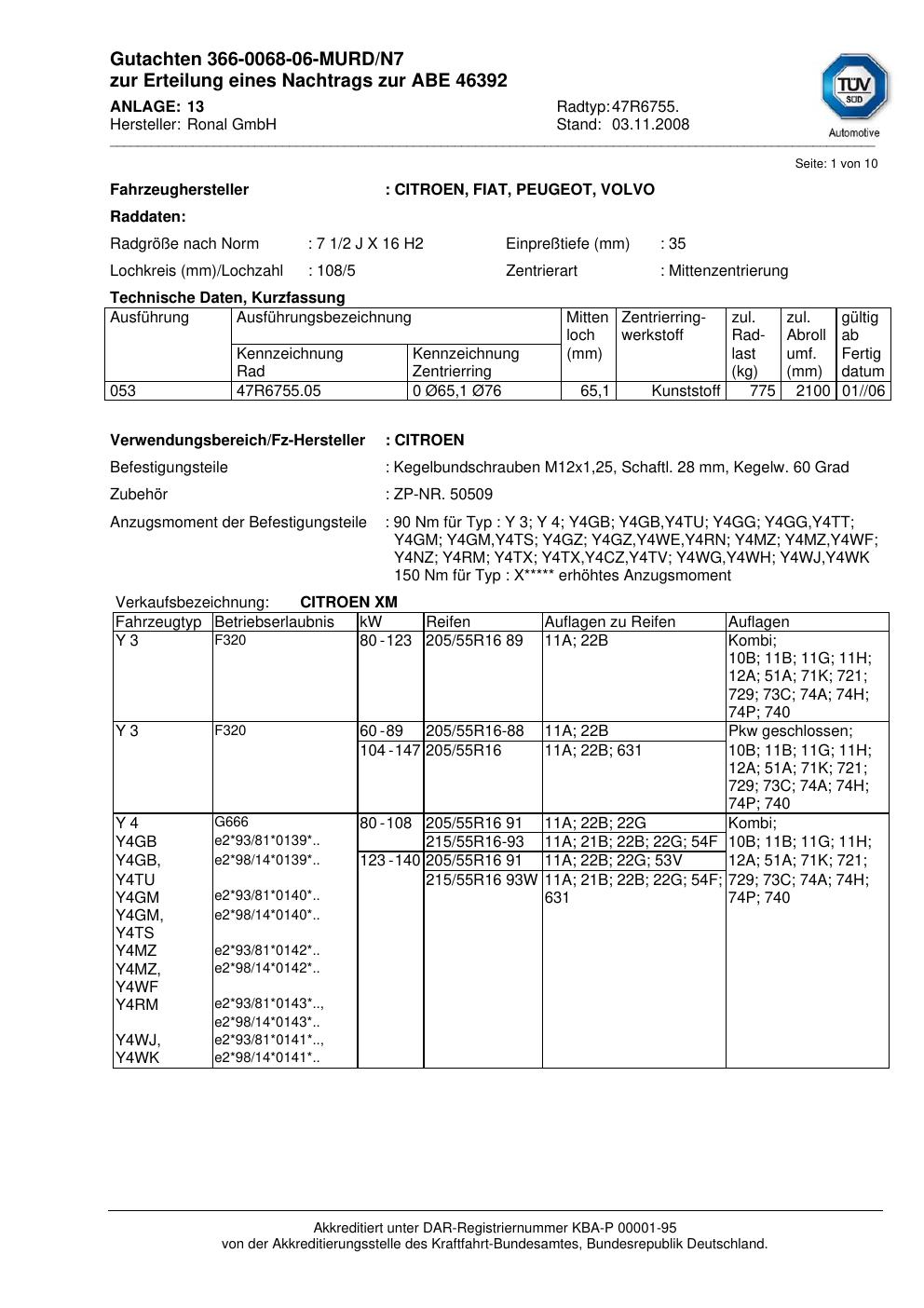 Dieses Gutachten (abe) bezieht sich auf die Alufelge Ronal 47R6755 in der Ausführung 2Jx16 ET 0, Mittenloch 0 mm (KBA 46392). Im PDF findest du typischerweise zulässige Reifengrößen, Auflagen/Anbauhinweise und – je nach Dokument – Hinweise zur Eintragung.