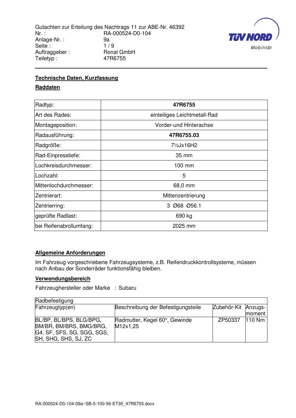 Dieses Gutachten (abe) bezieht sich auf die Alufelge brand-ronal 47R6755 in der Ausführung ET 0, Mittenloch 0 mm (KBA 46392). Im PDF findest du typischerweise zulässige Reifengrößen, Auflagen/Anbauhinweise und – je nach Dokument – Hinweise zur Eintragung.