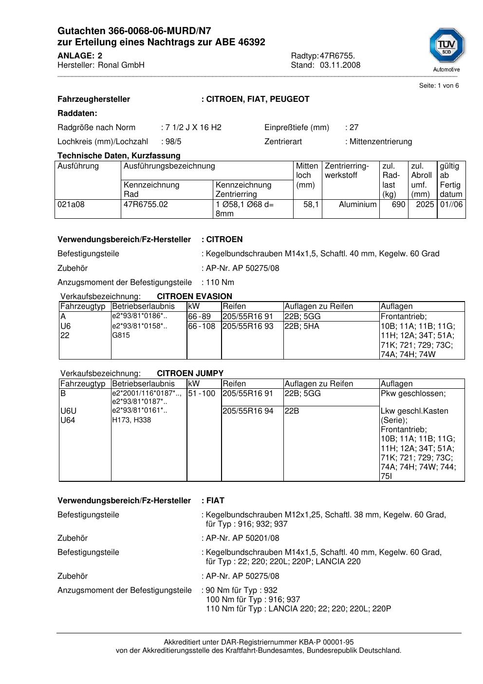 Dieses Gutachten (abe) bezieht sich auf die Alufelge Ronal 47R6755 in der Ausführung 2Jx16 ET 0, Mittenloch 0 mm (KBA 46392). Im PDF findest du typischerweise zulässige Reifengrößen, Auflagen/Anbauhinweise und – je nach Dokument – Hinweise zur Eintragung.