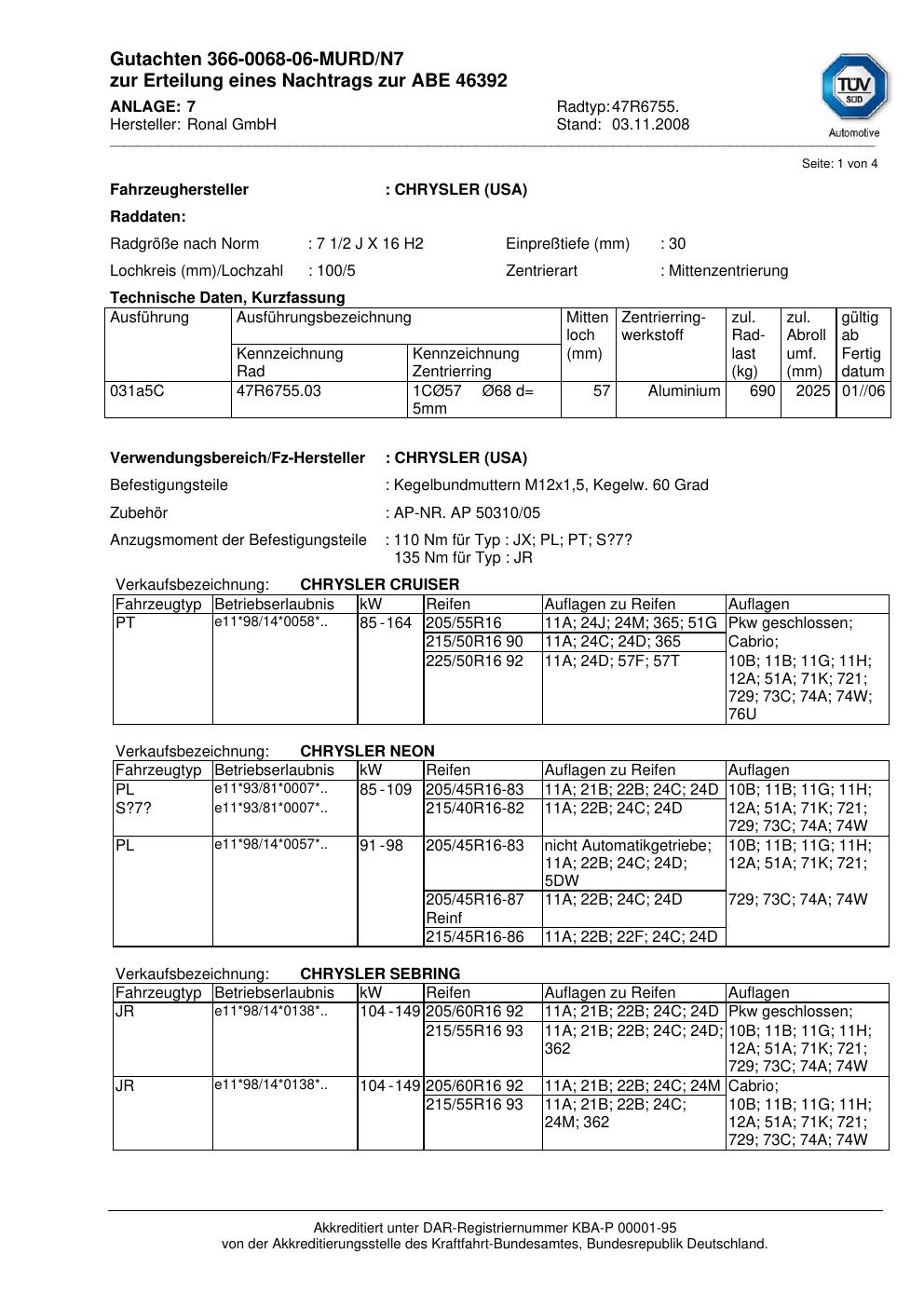 Dieses Gutachten (abe) bezieht sich auf die Alufelge brand-ronal 47R6755 in der Ausführung 2Jx16 ET 0, Mittenloch 0 mm (KBA 46392). Im PDF findest du typischerweise zulässige Reifengrößen, Auflagen/Anbauhinweise und – je nach Dokument – Hinweise zur Eintragung.