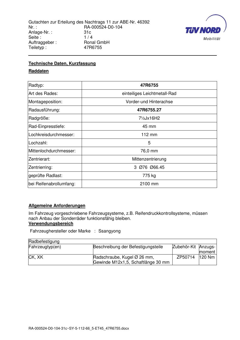 Dieses Gutachten (abe) bezieht sich auf die Alufelge brand-ronal 47R6755 in der Ausführung ET 0, Mittenloch 0 mm (KBA 46392). Im PDF findest du typischerweise zulässige Reifengrößen, Auflagen/Anbauhinweise und – je nach Dokument – Hinweise zur Eintragung.
