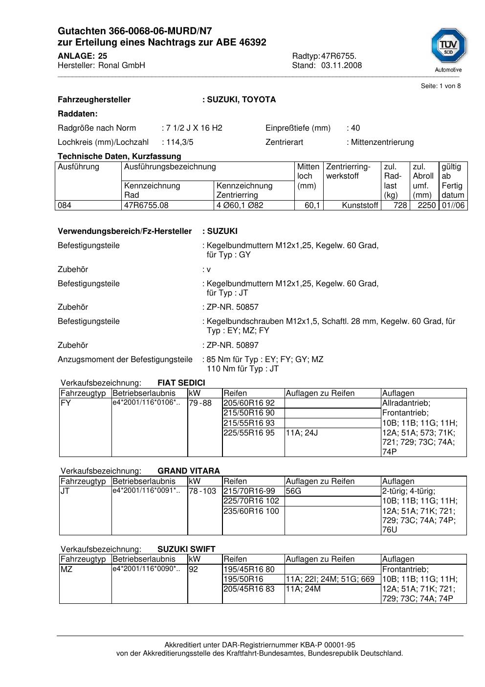 Dieses Gutachten (abe) bezieht sich auf die Alufelge Ronal 47R6755 in der Ausführung 2Jx16 ET 0, Mittenloch 0 mm (KBA 46392). Im PDF findest du typischerweise zulässige Reifengrößen, Auflagen/Anbauhinweise und – je nach Dokument – Hinweise zur Eintragung.