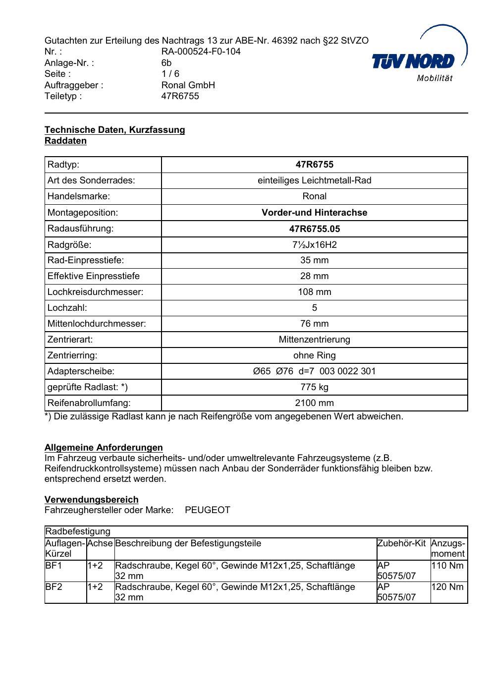Dieses Gutachten (abe) bezieht sich auf die Alufelge brand-ronal 47R6755 in der Ausführung ET 0, Mittenloch 0 mm (KBA 46392). Im PDF findest du typischerweise zulässige Reifengrößen, Auflagen/Anbauhinweise und – je nach Dokument – Hinweise zur Eintragung.