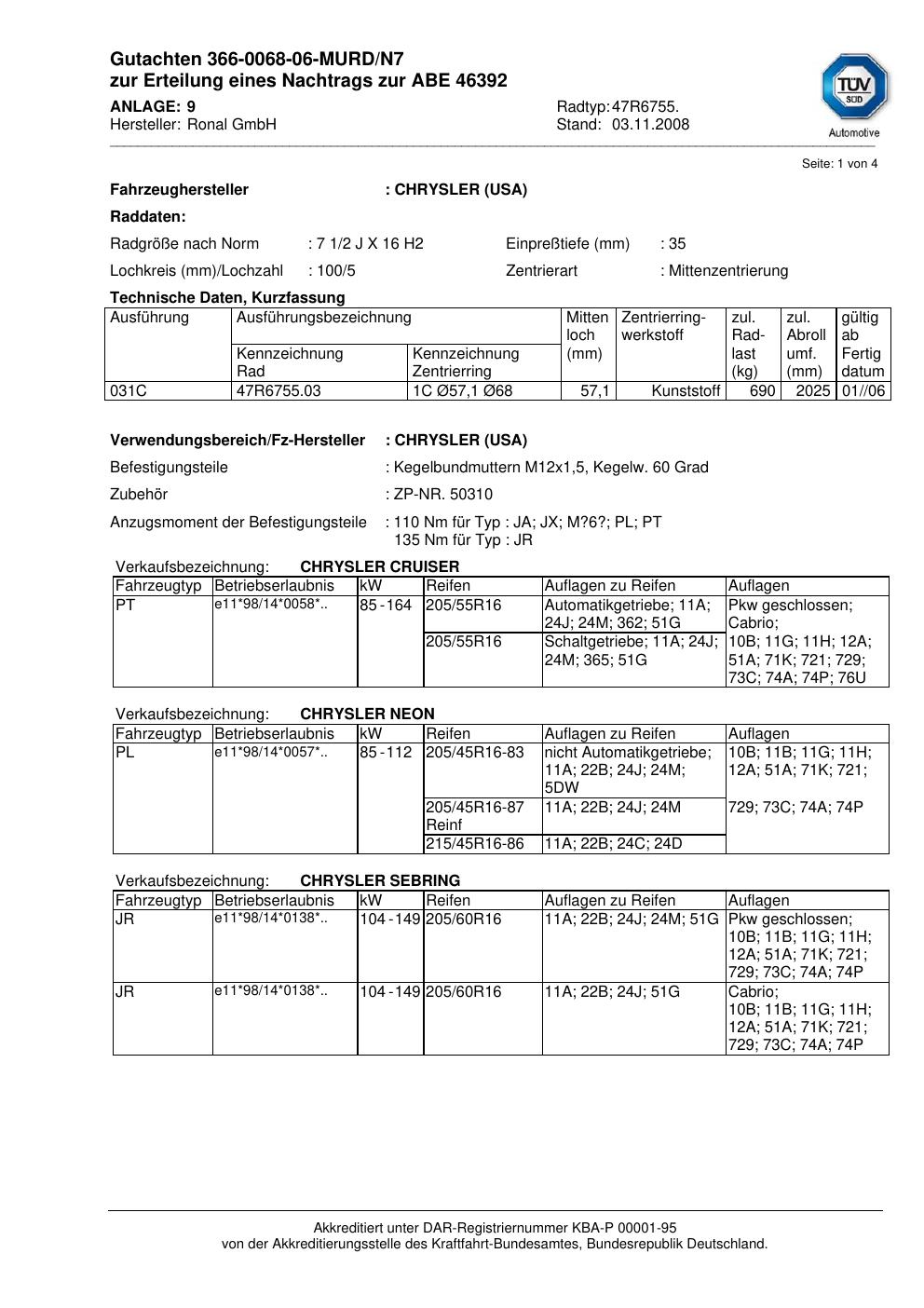 Dieses Gutachten (abe) bezieht sich auf die Alufelge Ronal 47R6755 in der Ausführung 2Jx16 ET 0, Mittenloch 0 mm (KBA 46392). Im PDF findest du typischerweise zulässige Reifengrößen, Auflagen/Anbauhinweise und – je nach Dokument – Hinweise zur Eintragung.