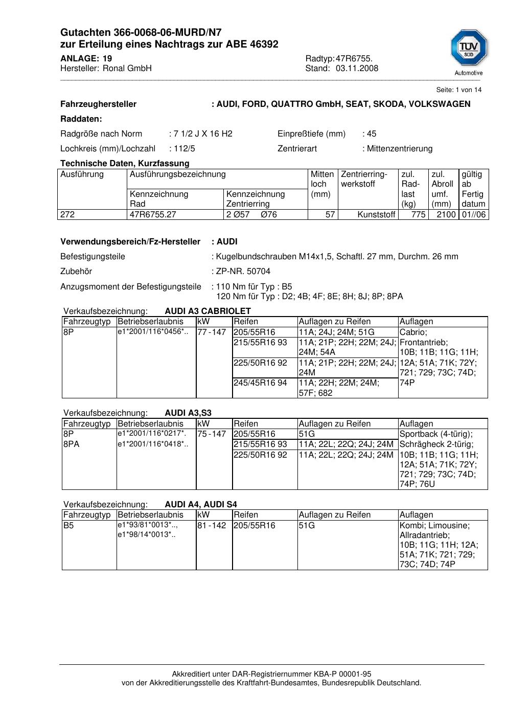 Dieses Gutachten (abe) bezieht sich auf die Alufelge Ronal 47R6755 in der Ausführung 2Jx16 ET 0, Mittenloch 0 mm (KBA 46392). Im PDF findest du typischerweise zulässige Reifengrößen, Auflagen/Anbauhinweise und – je nach Dokument – Hinweise zur Eintragung.