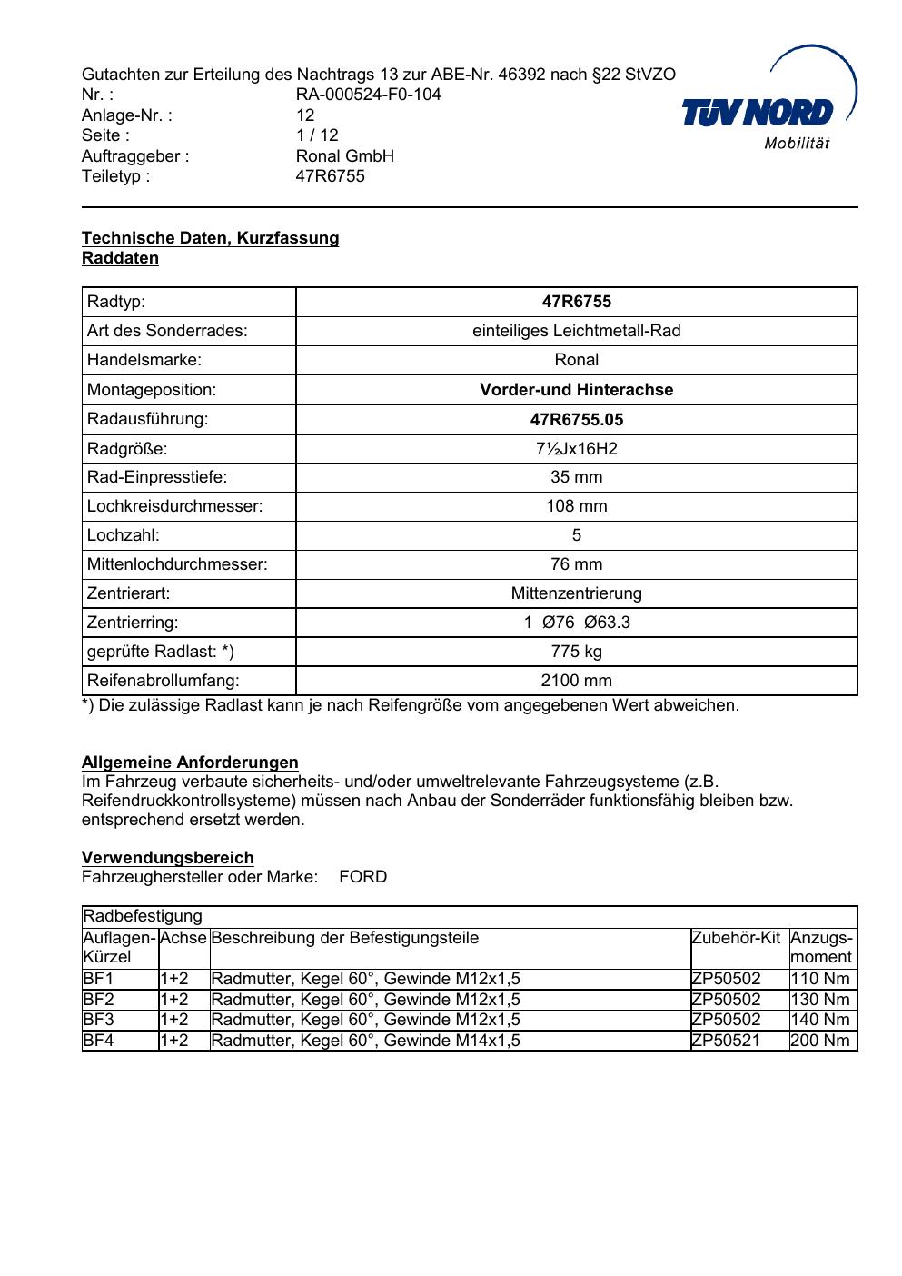 Dieses Gutachten (abe) bezieht sich auf die Alufelge brand-ronal 47R6755 in der Ausführung ET 0, Mittenloch 0 mm (KBA 46392). Im PDF findest du typischerweise zulässige Reifengrößen, Auflagen/Anbauhinweise und – je nach Dokument – Hinweise zur Eintragung.