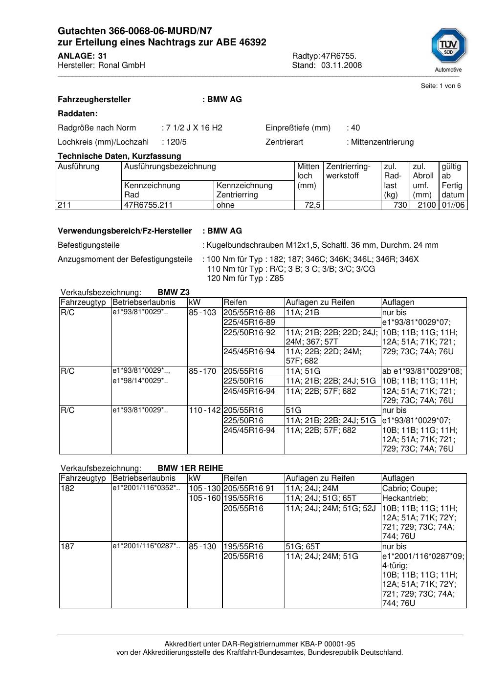 Dieses Gutachten (abe) bezieht sich auf die Alufelge Ronal 47R6755 in der Ausführung 2Jx16 ET 0, Mittenloch 0 mm (KBA 46392). Im PDF findest du typischerweise zulässige Reifengrößen, Auflagen/Anbauhinweise und – je nach Dokument – Hinweise zur Eintragung.