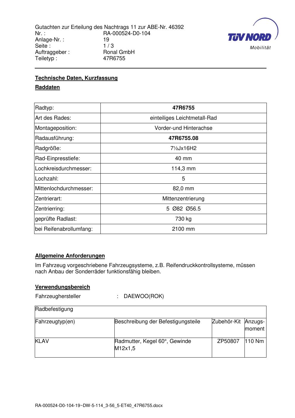 Dieses Gutachten (abe) bezieht sich auf die Alufelge brand-ronal 47R6755 in der Ausführung ET 0, Mittenloch 0 mm (KBA 46392). Im PDF findest du typischerweise zulässige Reifengrößen, Auflagen/Anbauhinweise und – je nach Dokument – Hinweise zur Eintragung.