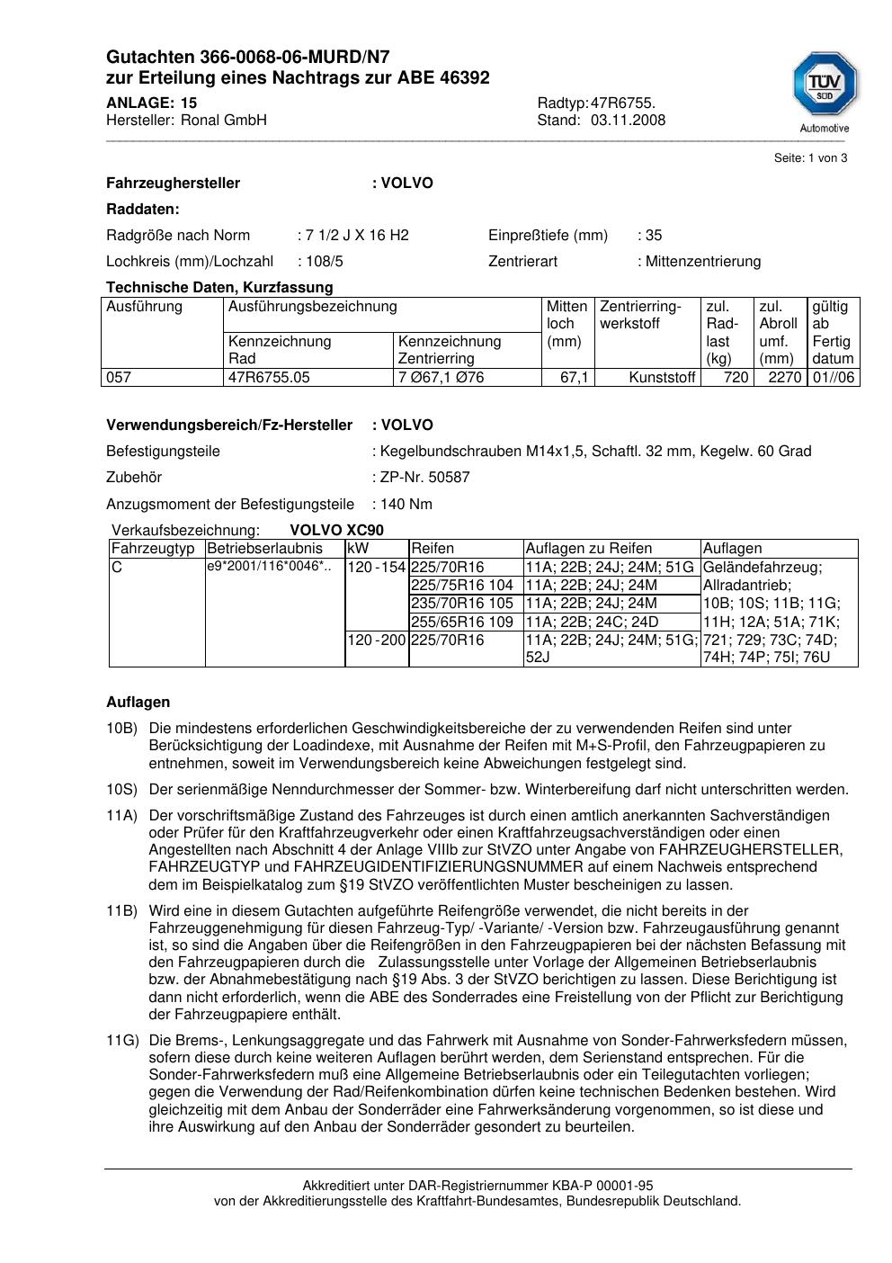 Dieses Gutachten (abe) bezieht sich auf die Alufelge Ronal 47R6755 in der Ausführung 2Jx16 ET 0, Mittenloch 0 mm (KBA 46392). Im PDF findest du typischerweise zulässige Reifengrößen, Auflagen/Anbauhinweise und – je nach Dokument – Hinweise zur Eintragung.