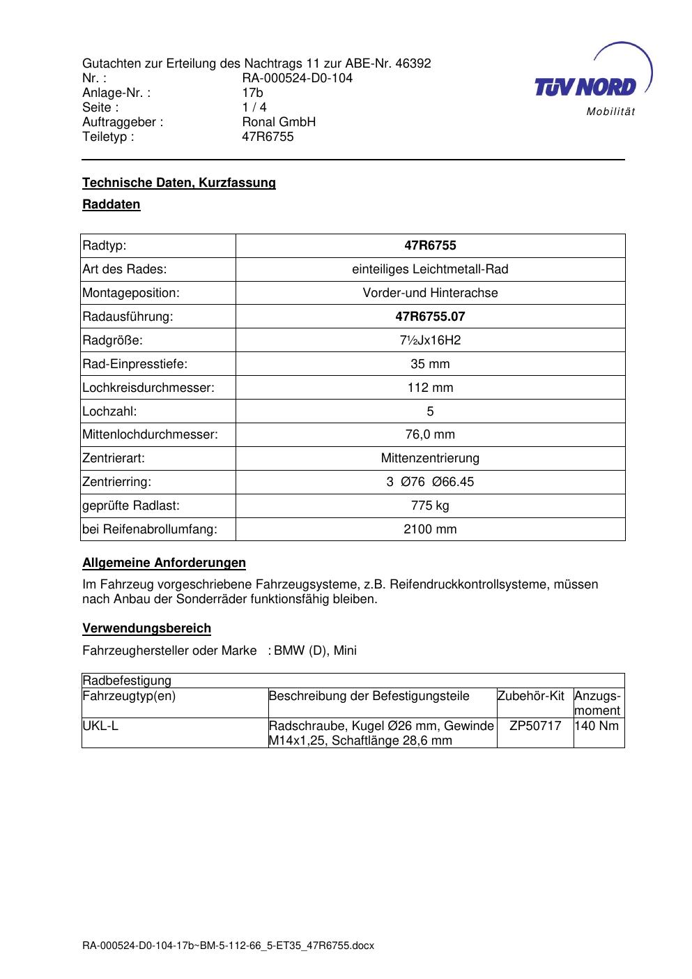 Dieses Gutachten (abe) bezieht sich auf die Alufelge brand-ronal 47R6755 in der Ausführung ET 0, Mittenloch 0 mm (KBA 46392). Im PDF findest du typischerweise zulässige Reifengrößen, Auflagen/Anbauhinweise und – je nach Dokument – Hinweise zur Eintragung.