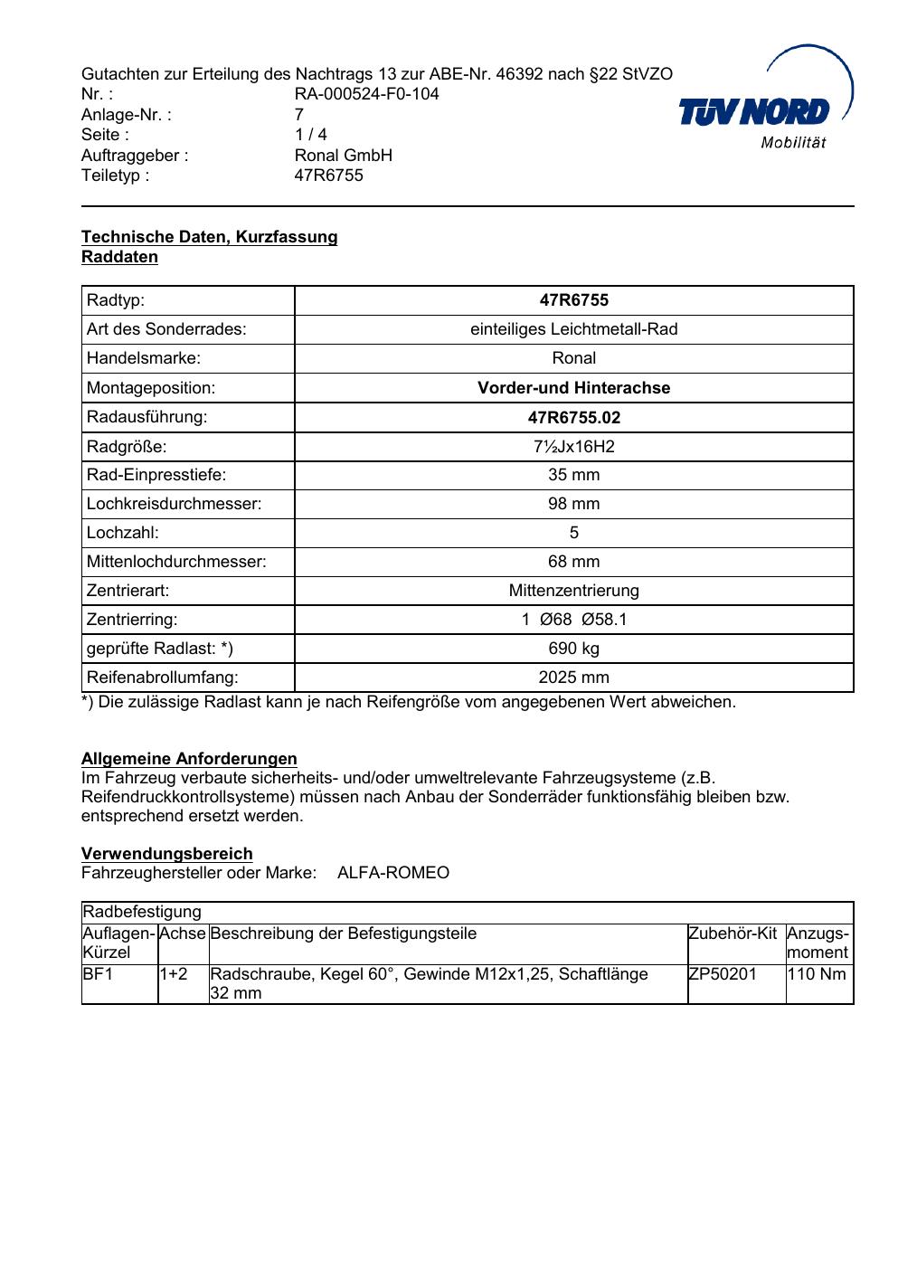 Dieses Gutachten (abe) bezieht sich auf die Alufelge brand-ronal 47R6755 in der Ausführung ET 0, Mittenloch 0 mm (KBA 46392). Im PDF findest du typischerweise zulässige Reifengrößen, Auflagen/Anbauhinweise und – je nach Dokument – Hinweise zur Eintragung.