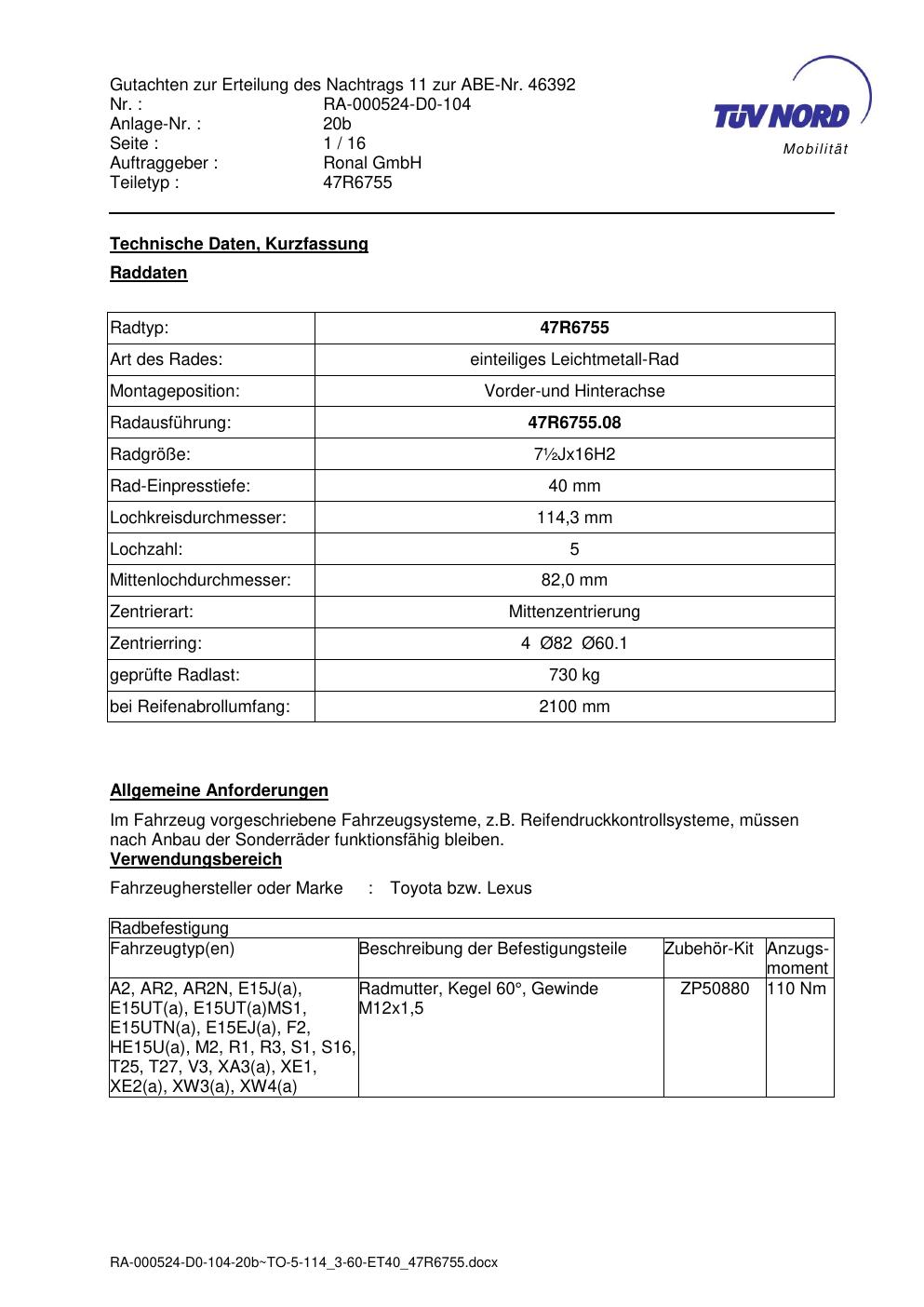 Dieses Gutachten (abe) bezieht sich auf die Alufelge brand-ronal 47R6755 in der Ausführung ET 0, Mittenloch 0 mm (KBA 46392). Im PDF findest du typischerweise zulässige Reifengrößen, Auflagen/Anbauhinweise und – je nach Dokument – Hinweise zur Eintragung.