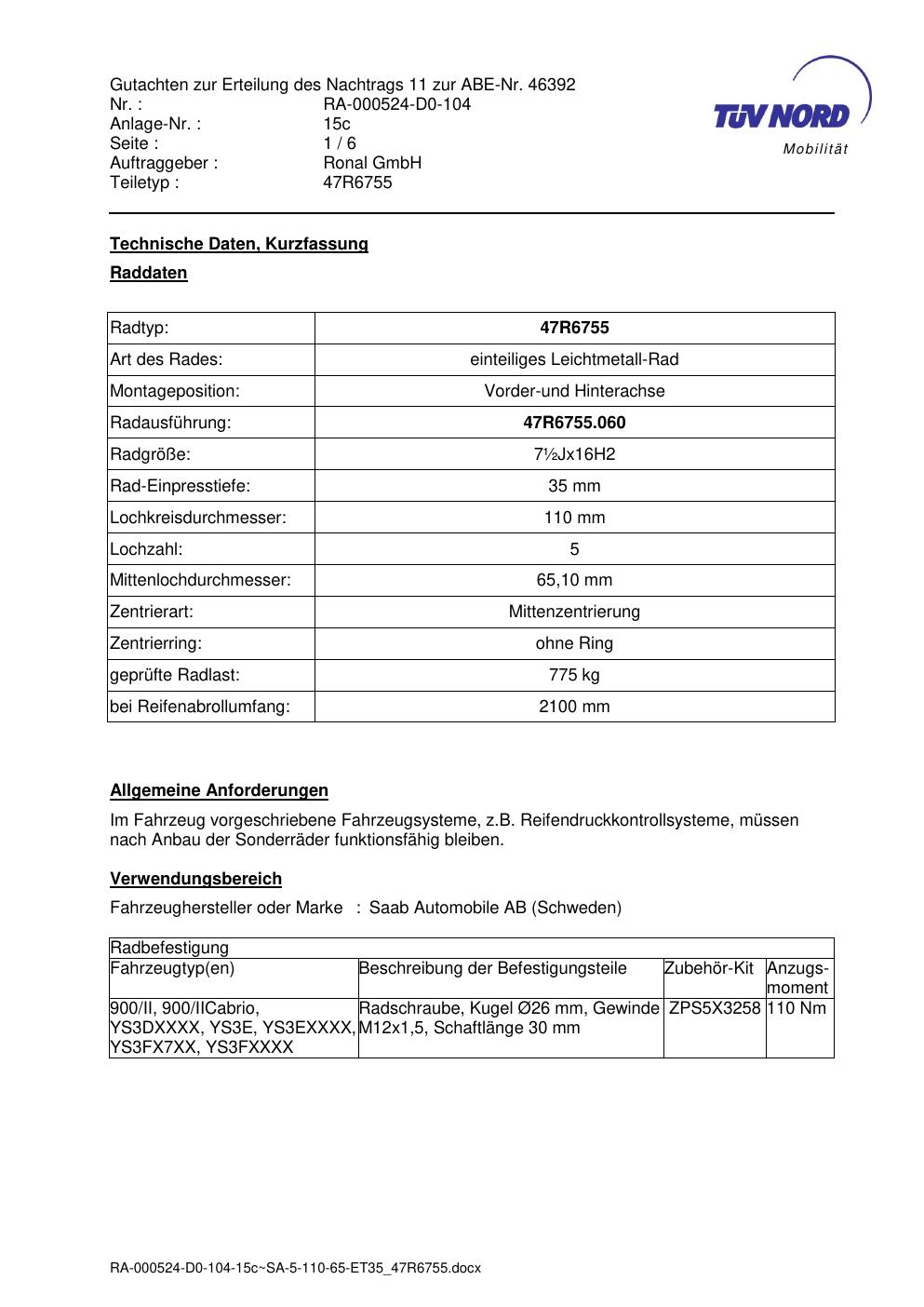 Dieses Gutachten (abe) bezieht sich auf die Alufelge brand-ronal 47R6755 in der Ausführung ET 0, Mittenloch 0 mm (KBA 46392). Im PDF findest du typischerweise zulässige Reifengrößen, Auflagen/Anbauhinweise und – je nach Dokument – Hinweise zur Eintragung.