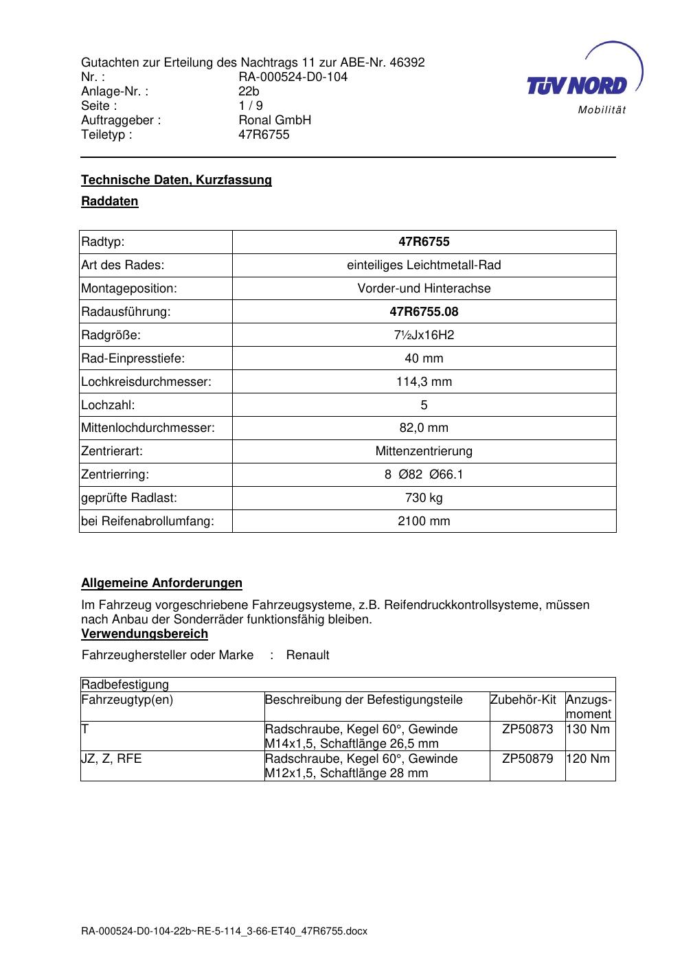 Dieses Gutachten (abe) bezieht sich auf die Alufelge brand-ronal 47R6755 in der Ausführung ET 0, Mittenloch 0 mm (KBA 46392). Im PDF findest du typischerweise zulässige Reifengrößen, Auflagen/Anbauhinweise und – je nach Dokument – Hinweise zur Eintragung.