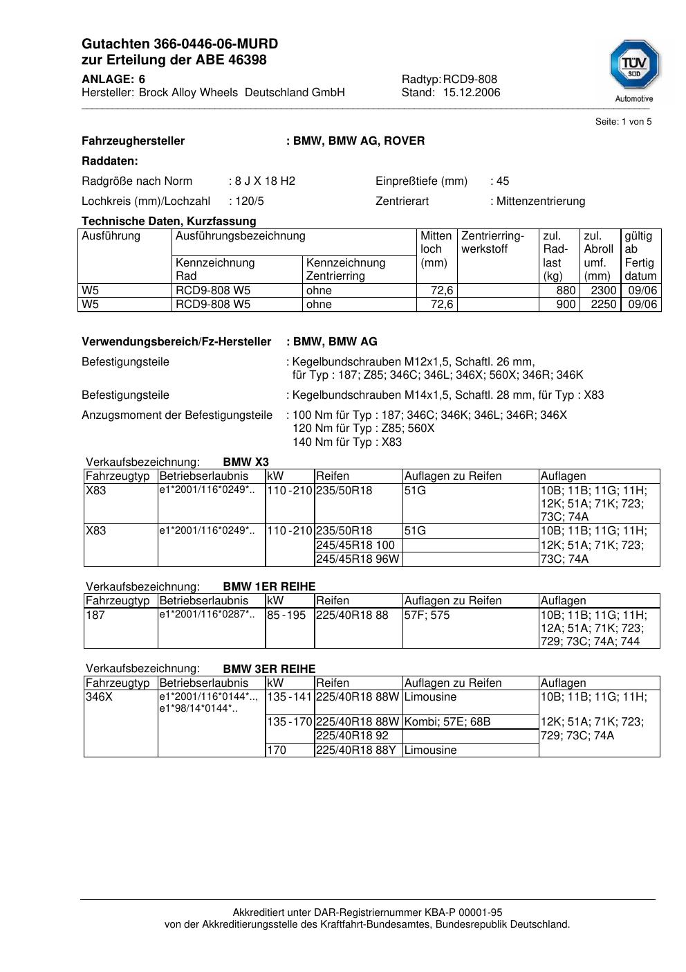 Dieses Gutachten (abe) bezieht sich auf die Alufelge Brock RCD9-808 in der Ausführung 8Jx18 ET 0, Mittenloch 0 mm (KBA 46398). Im PDF findest du typischerweise zulässige Reifengrößen, Auflagen/Anbauhinweise und – je nach Dokument – Hinweise zur Eintragung.