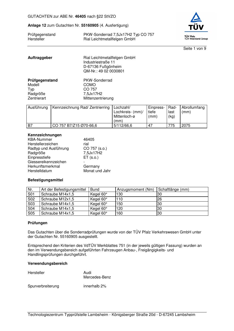 Dieses Gutachten (abe) bezieht sich auf die Alufelge brand-rial CO 757 in der Ausführung 7.5Jx17 ET 0, Mittenloch 0 mm (KBA 46405). Im PDF findest du typischerweise zulässige Reifengrößen, Auflagen/Anbauhinweise und – je nach Dokument – Hinweise zur Eintragung.