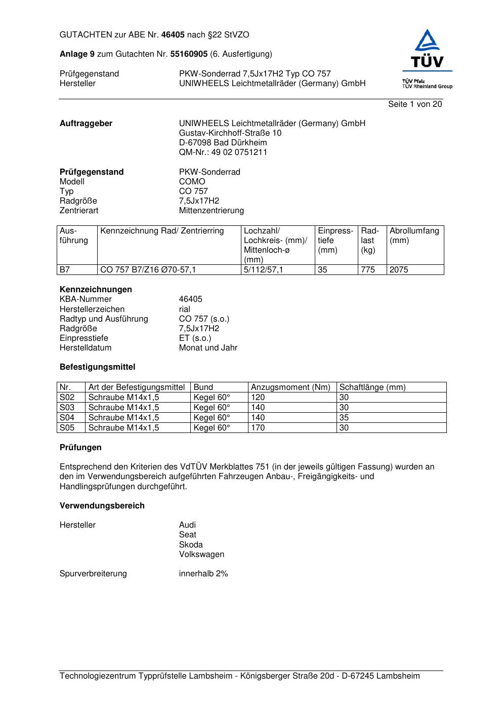 Dieses Gutachten (abe) bezieht sich auf die Alufelge brand-rial CO 757 in der Ausführung 7.5Jx17 ET 0, Mittenloch 0 mm (KBA 46405). Im PDF findest du typischerweise zulässige Reifengrößen, Auflagen/Anbauhinweise und – je nach Dokument – Hinweise zur Eintragung.