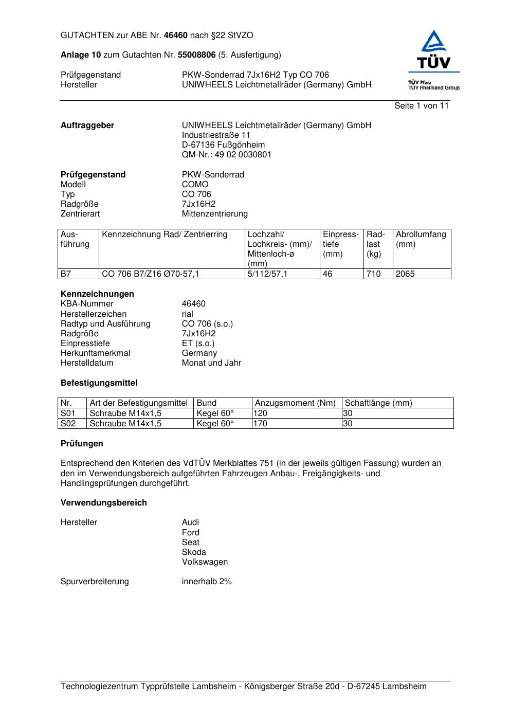 Dieses Gutachten (abe) bezieht sich auf die Alufelge brand-rial CO 706 in der Ausführung 7Jx16 ET 0, Mittenloch 0 mm (KBA 46460). Im PDF findest du typischerweise zulässige Reifengrößen, Auflagen/Anbauhinweise und – je nach Dokument – Hinweise zur Eintragung.