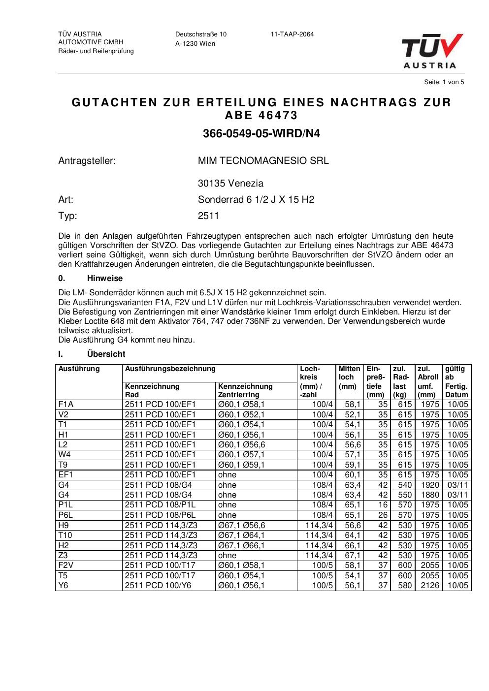 Dieses Gutachten (abe) bezieht sich auf die Alufelge ATS 2511 in der Ausführung 2Jx15 ET 0, Mittenloch 0 mm (KBA 46473). Im PDF findest du typischerweise zulässige Reifengrößen, Auflagen/Anbauhinweise und – je nach Dokument – Hinweise zur Eintragung.