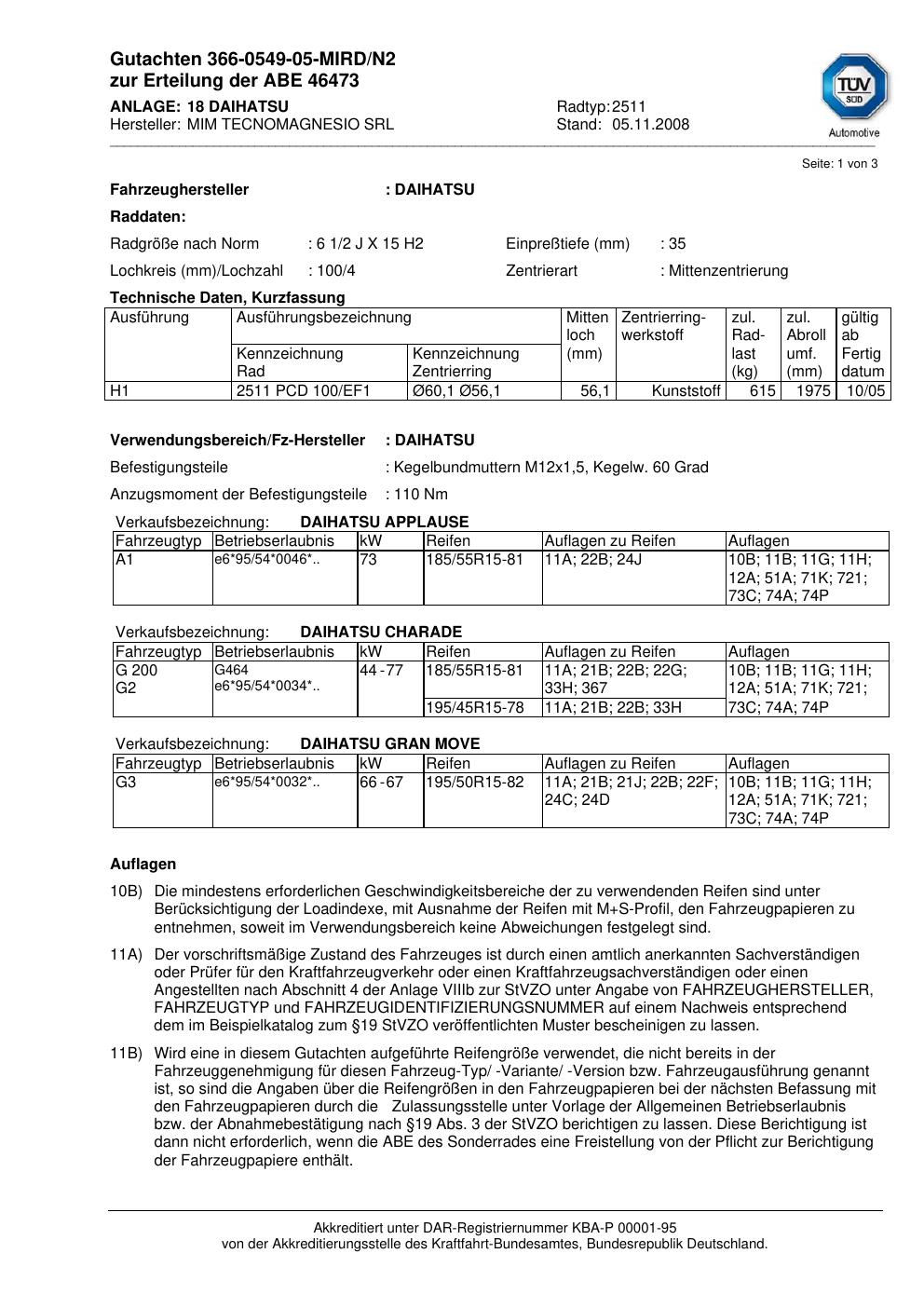 Dieses Gutachten (abe) bezieht sich auf die Alufelge ATS 2511 in der Ausführung 2Jx15 ET 0, Mittenloch 0 mm (KBA 46473). Im PDF findest du typischerweise zulässige Reifengrößen, Auflagen/Anbauhinweise und – je nach Dokument – Hinweise zur Eintragung.