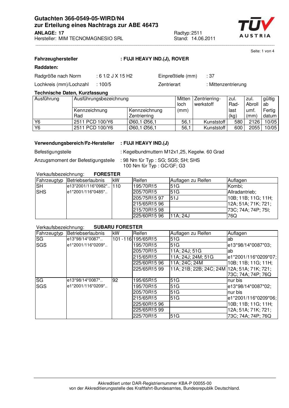 Dieses Gutachten (abe) bezieht sich auf die Alufelge ATS 2511 in der Ausführung 2Jx15 ET 0, Mittenloch 0 mm (KBA 46473). Im PDF findest du typischerweise zulässige Reifengrößen, Auflagen/Anbauhinweise und – je nach Dokument – Hinweise zur Eintragung.
