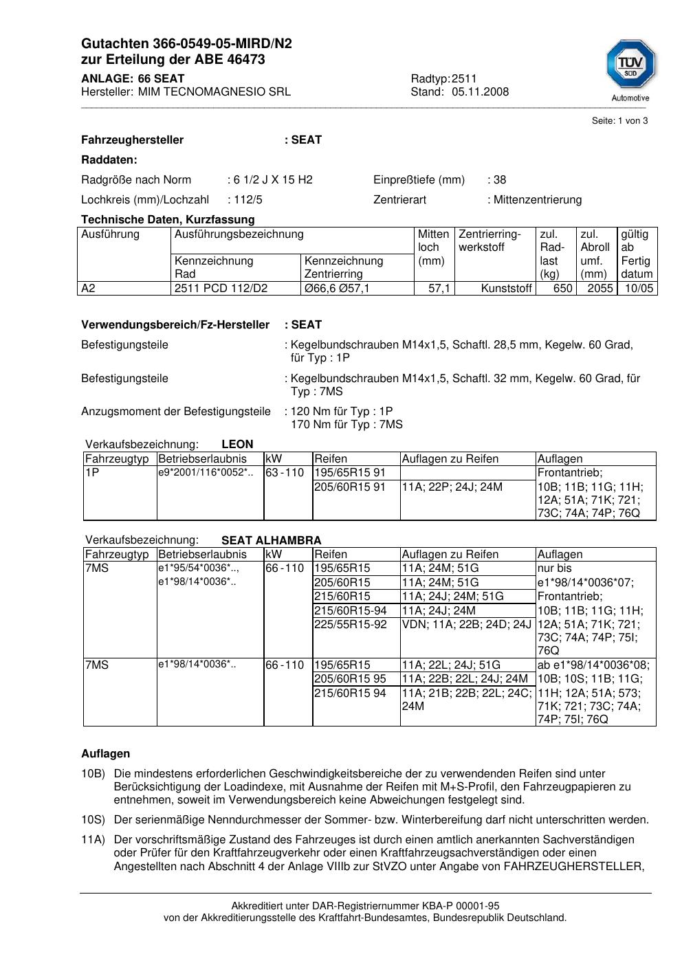 Felgengutachten / abe für Alufelgen ATS 2511 (2Jx15 ET 0, Mittenloch 0 mm) mit KBA 46473 (Zertifikatsnummer 46473). Hier kostenlos als PDF herunterladen. Der Download-Link ist 24 Stunden gültig und kann bis zu zwei Mal verwendet werden.