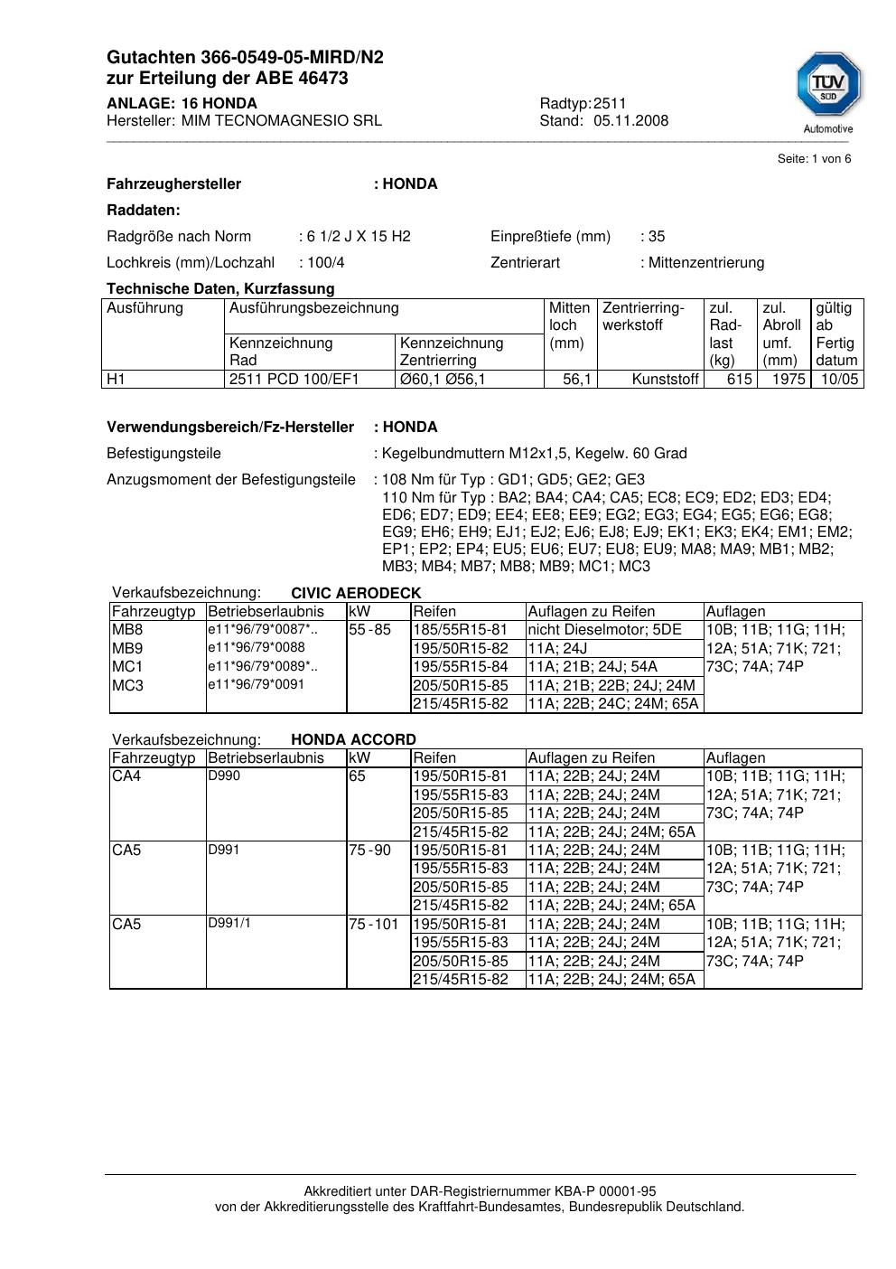 Dieses Gutachten (abe) bezieht sich auf die Alufelge co-rod 2511 in der Ausführung 2Jx15 ET 0, Mittenloch 0 mm (KBA 46473). Im PDF findest du typischerweise zulässige Reifengrößen, Auflagen/Anbauhinweise und – je nach Dokument – Hinweise zur Eintragung.