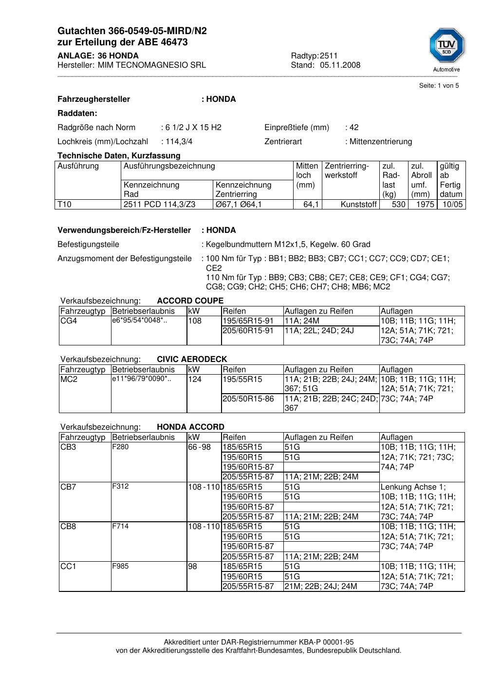 Dieses Gutachten (abe) bezieht sich auf die Alufelge co-rod 2511 in der Ausführung 2Jx15 ET 0, Mittenloch 0 mm (KBA 46473). Im PDF findest du typischerweise zulässige Reifengrößen, Auflagen/Anbauhinweise und – je nach Dokument – Hinweise zur Eintragung.