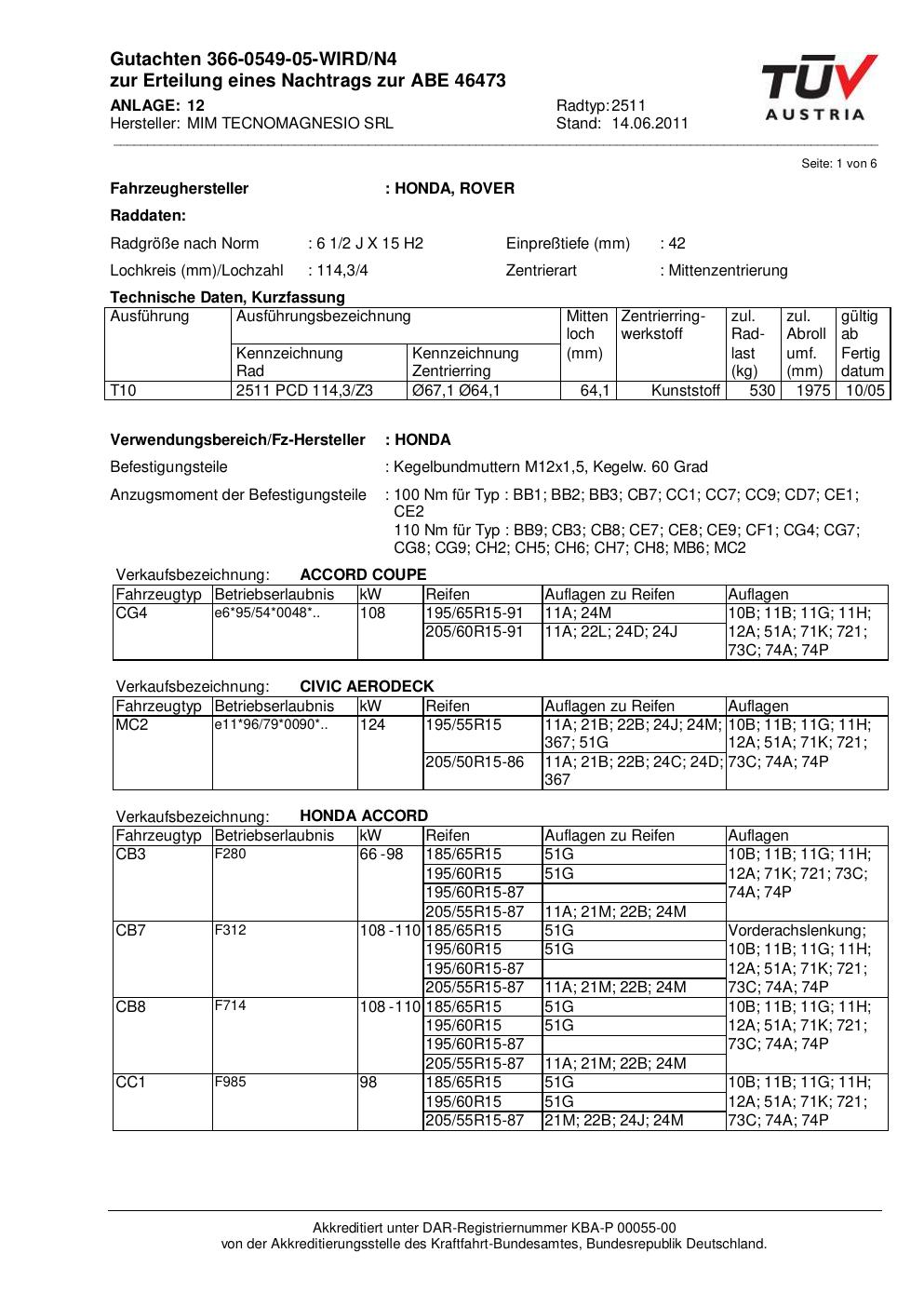 Dieses Gutachten (abe) bezieht sich auf die Alufelge co-rod 2511 in der Ausführung 2Jx15 ET 0, Mittenloch 0 mm (KBA 46473). Im PDF findest du typischerweise zulässige Reifengrößen, Auflagen/Anbauhinweise und – je nach Dokument – Hinweise zur Eintragung.