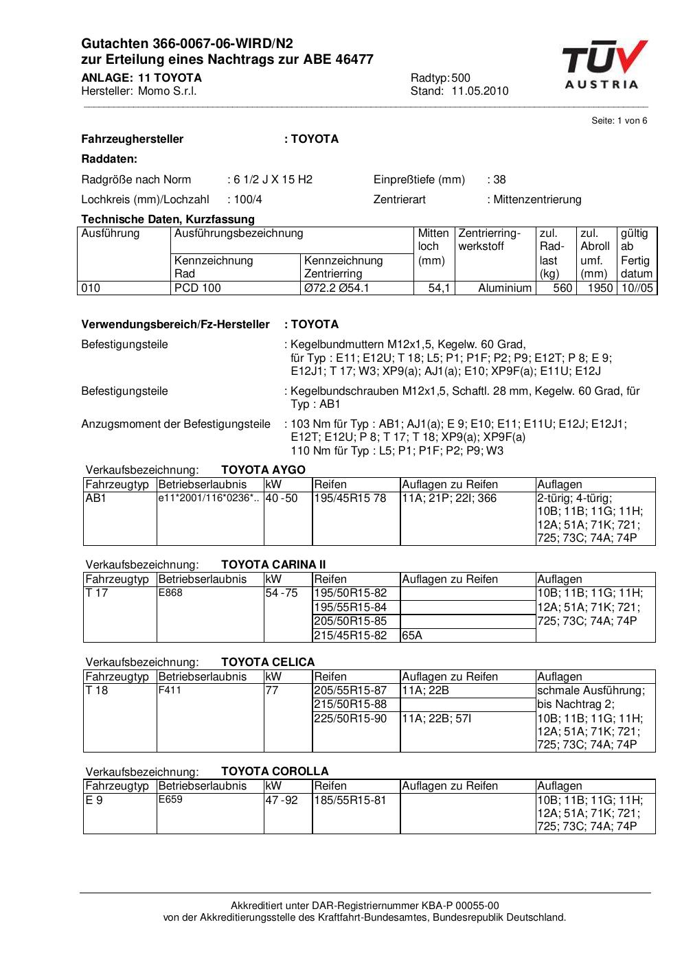 Dieses Gutachten (abe) bezieht sich auf die Alufelge brand-momo 500 in der Ausführung 2Jx15 ET 0, Mittenloch 0 mm (KBA 46477). Im PDF findest du typischerweise zulässige Reifengrößen, Auflagen/Anbauhinweise und – je nach Dokument – Hinweise zur Eintragung.
