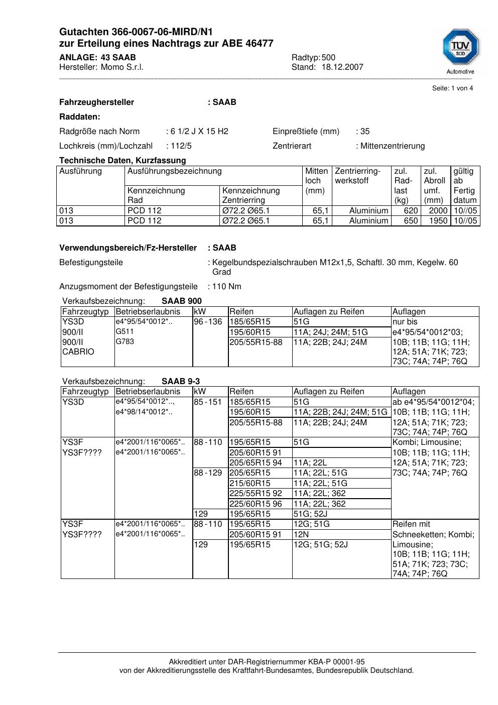 Dieses Gutachten (abe) bezieht sich auf die Alufelge brand-momo 500 in der Ausführung 2Jx15 ET 0, Mittenloch 0 mm (KBA 46477). Im PDF findest du typischerweise zulässige Reifengrößen, Auflagen/Anbauhinweise und – je nach Dokument – Hinweise zur Eintragung.