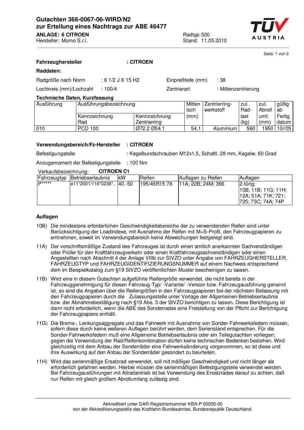 Dieses Gutachten (abe) bezieht sich auf die Alufelge brand-momo 500 in der Ausführung 2Jx15 ET 0, Mittenloch 0 mm (KBA 46477). Im PDF findest du typischerweise zulässige Reifengrößen, Auflagen/Anbauhinweise und – je nach Dokument – Hinweise zur Eintragung.