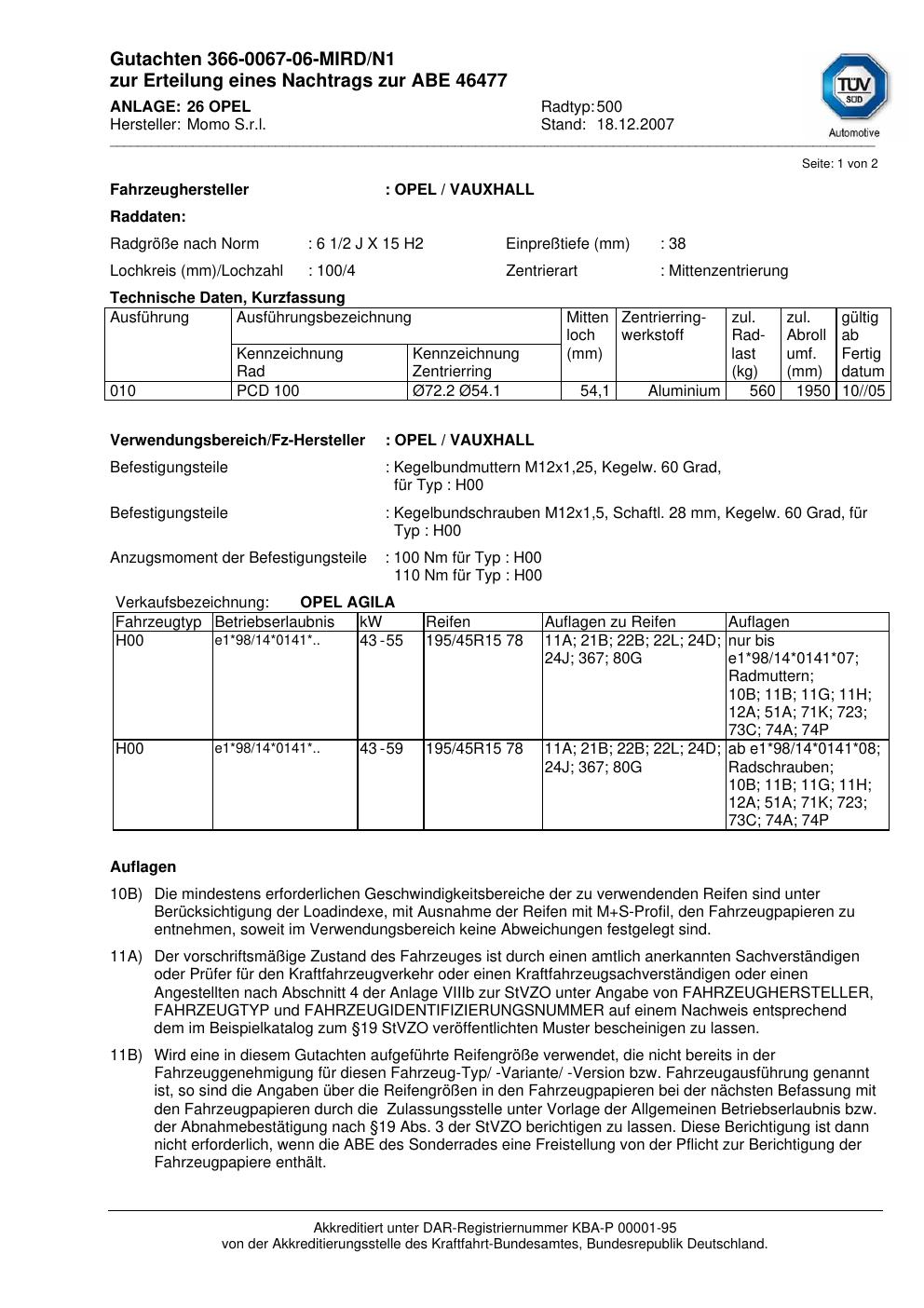 Dieses Gutachten (abe) bezieht sich auf die Alufelge brand-momo 500 in der Ausführung 2Jx15 ET 0, Mittenloch 0 mm (KBA 46477). Im PDF findest du typischerweise zulässige Reifengrößen, Auflagen/Anbauhinweise und – je nach Dokument – Hinweise zur Eintragung.
