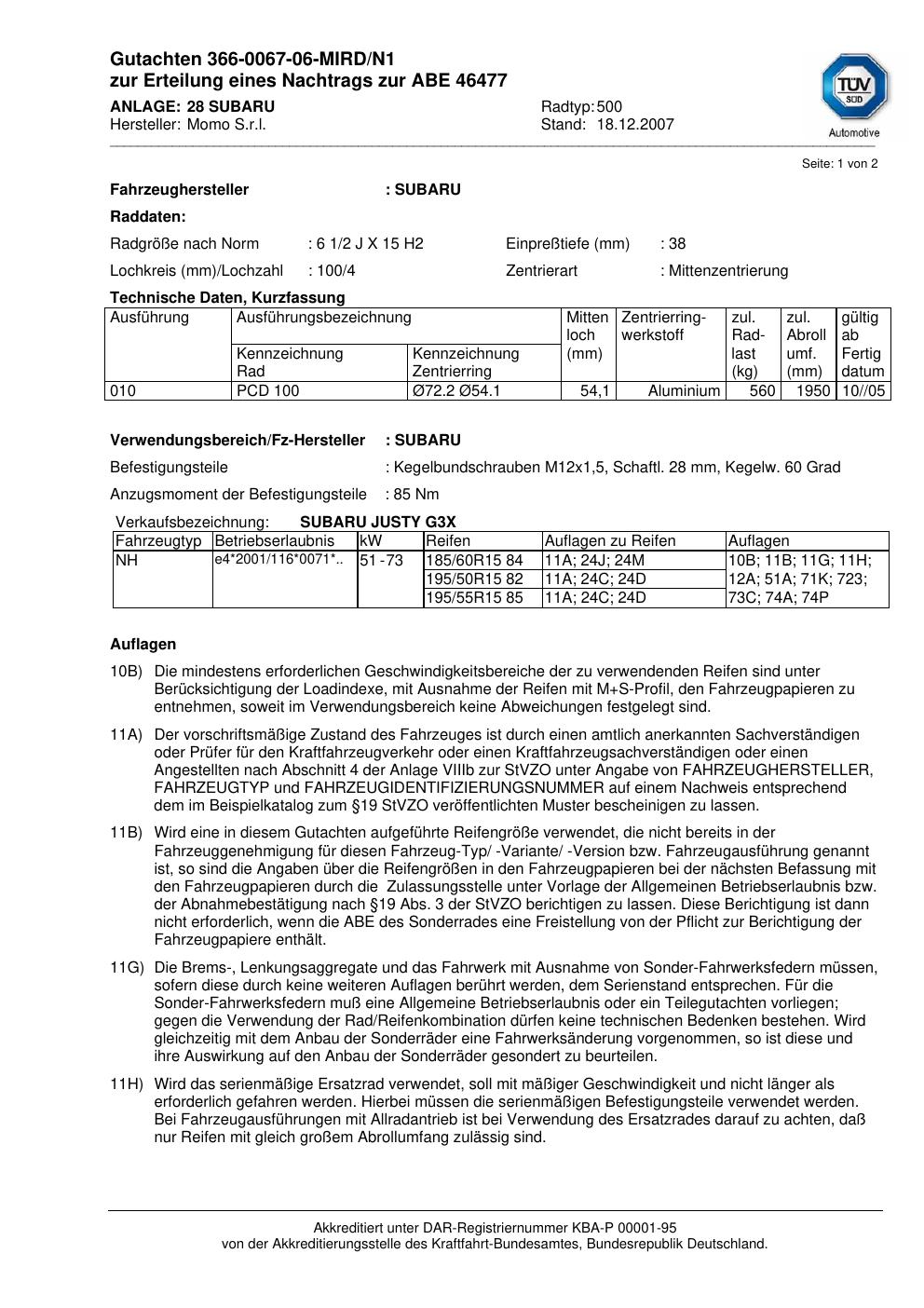 Dieses Gutachten (abe) bezieht sich auf die Alufelge brand-momo 500 in der Ausführung 2Jx15 ET 0, Mittenloch 0 mm (KBA 46477). Im PDF findest du typischerweise zulässige Reifengrößen, Auflagen/Anbauhinweise und – je nach Dokument – Hinweise zur Eintragung.