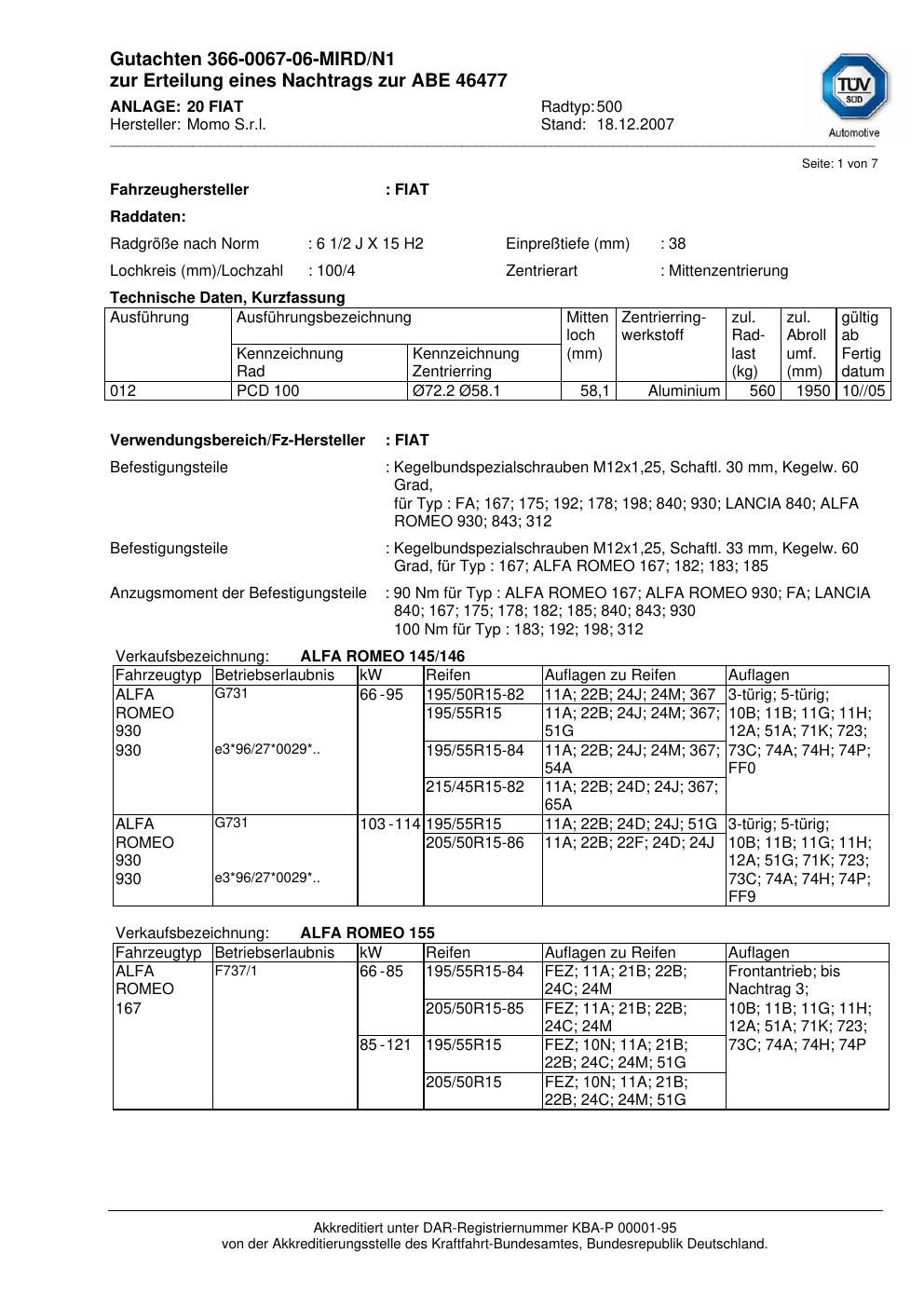 Dieses Gutachten (abe) bezieht sich auf die Alufelge brand-momo 500 in der Ausführung 2Jx15 ET 0, Mittenloch 0 mm (KBA 46477). Im PDF findest du typischerweise zulässige Reifengrößen, Auflagen/Anbauhinweise und – je nach Dokument – Hinweise zur Eintragung.