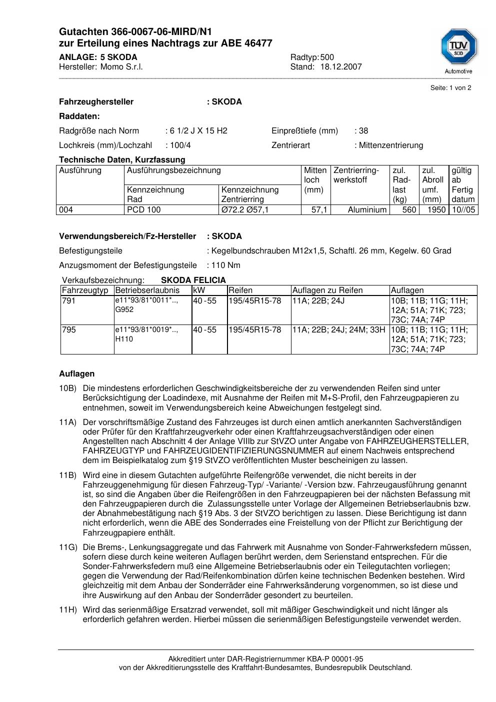 Dieses Gutachten (abe) bezieht sich auf die Alufelge brand-momo 500 in der Ausführung 2Jx15 ET 0, Mittenloch 0 mm (KBA 46477). Im PDF findest du typischerweise zulässige Reifengrößen, Auflagen/Anbauhinweise und – je nach Dokument – Hinweise zur Eintragung.