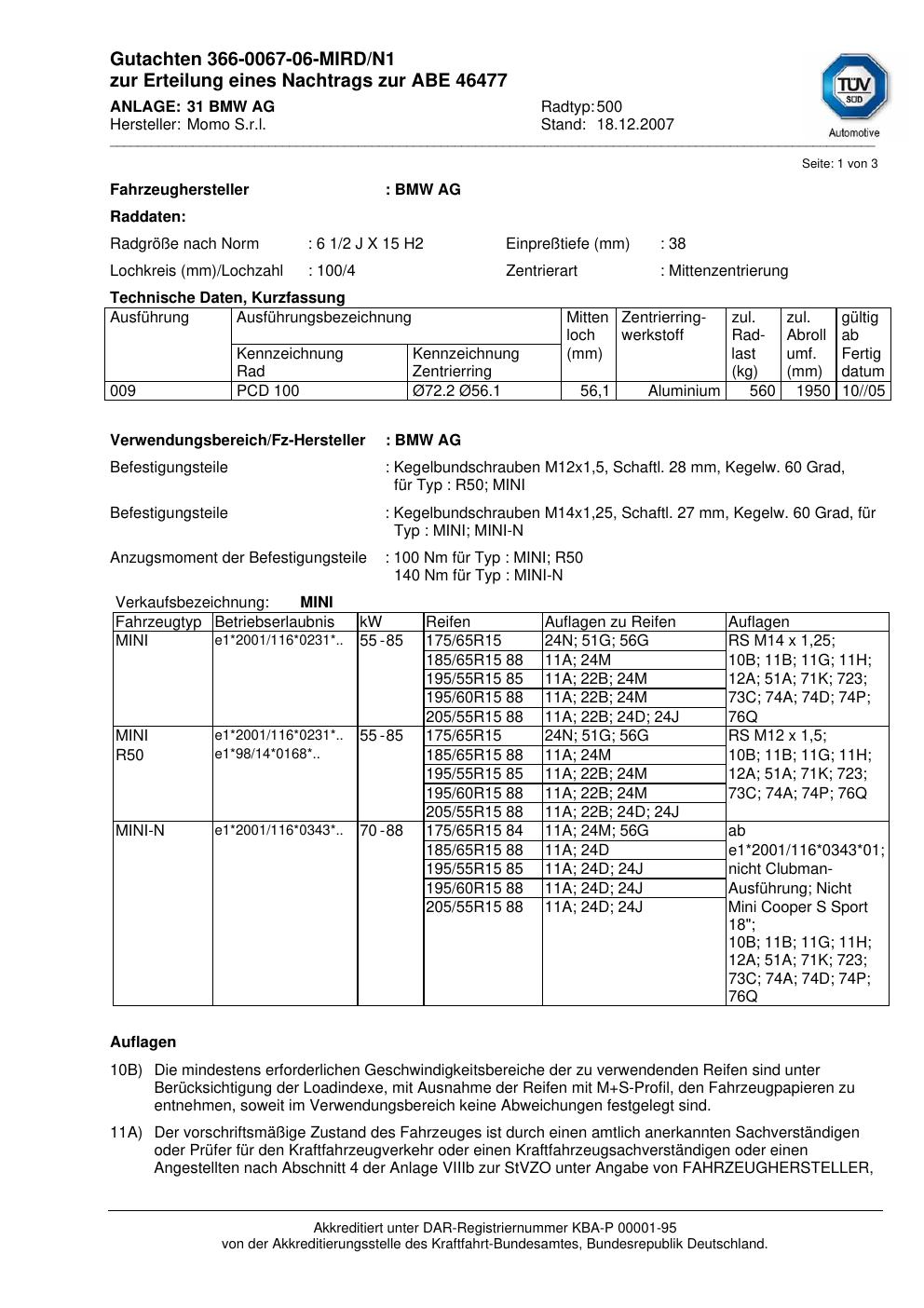 Dieses Gutachten (abe) bezieht sich auf die Alufelge brand-momo 500 in der Ausführung 2Jx15 ET 0, Mittenloch 0 mm (KBA 46477). Im PDF findest du typischerweise zulässige Reifengrößen, Auflagen/Anbauhinweise und – je nach Dokument – Hinweise zur Eintragung.