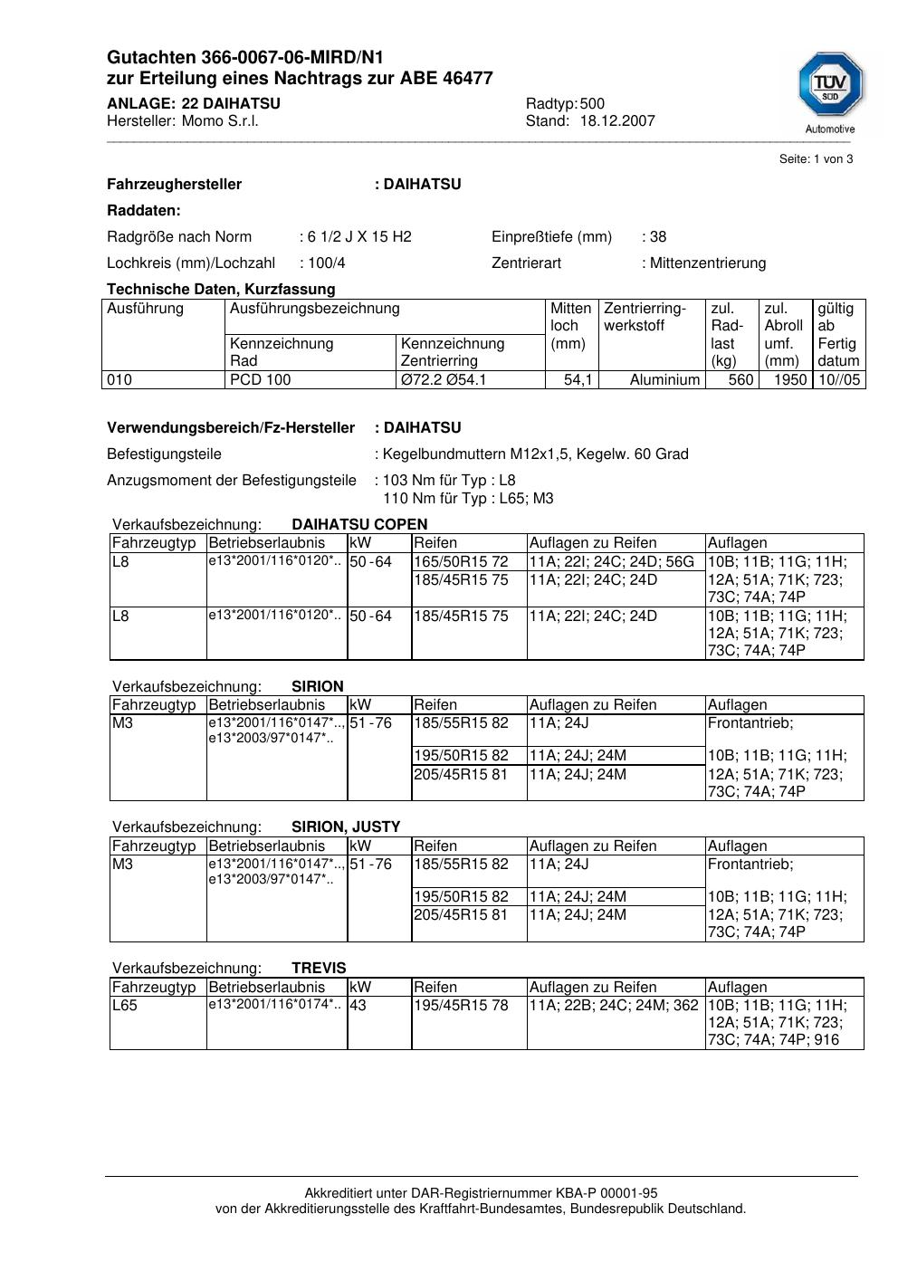 Dieses Gutachten (abe) bezieht sich auf die Alufelge brand-momo 500 in der Ausführung 2Jx15 ET 0, Mittenloch 0 mm (KBA 46477). Im PDF findest du typischerweise zulässige Reifengrößen, Auflagen/Anbauhinweise und – je nach Dokument – Hinweise zur Eintragung.